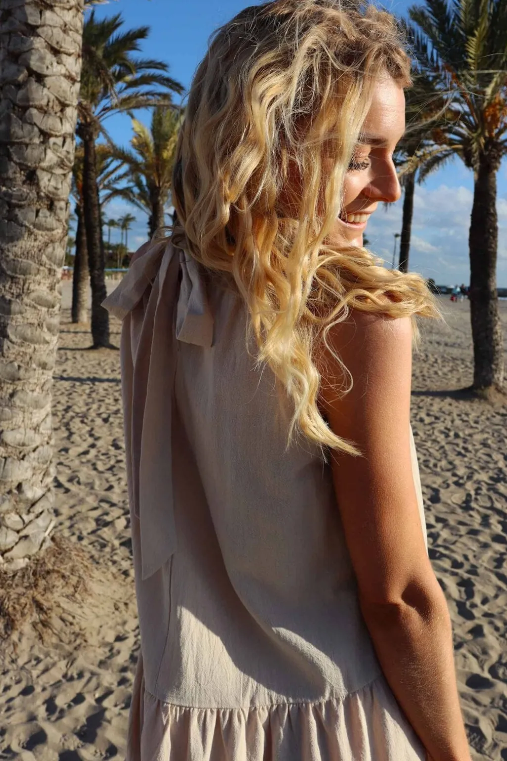 Sommerkjole fra Liberte i beige bomuldsstof. Kjolen har et halterneck-design med en sløjfe i nakken og et lagdelt skørt med flere niveauer.