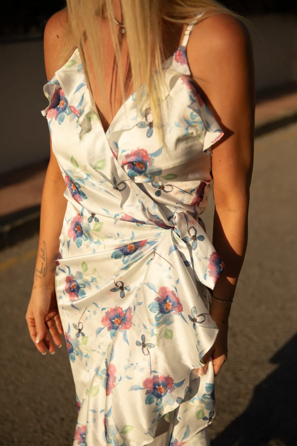 Lang kjole fra Valentin Studio i hvid med blå og pink blomsterprint. Den har tynde stropper, V-udskæring og flæsedetaljer langs omslagsdesignet.