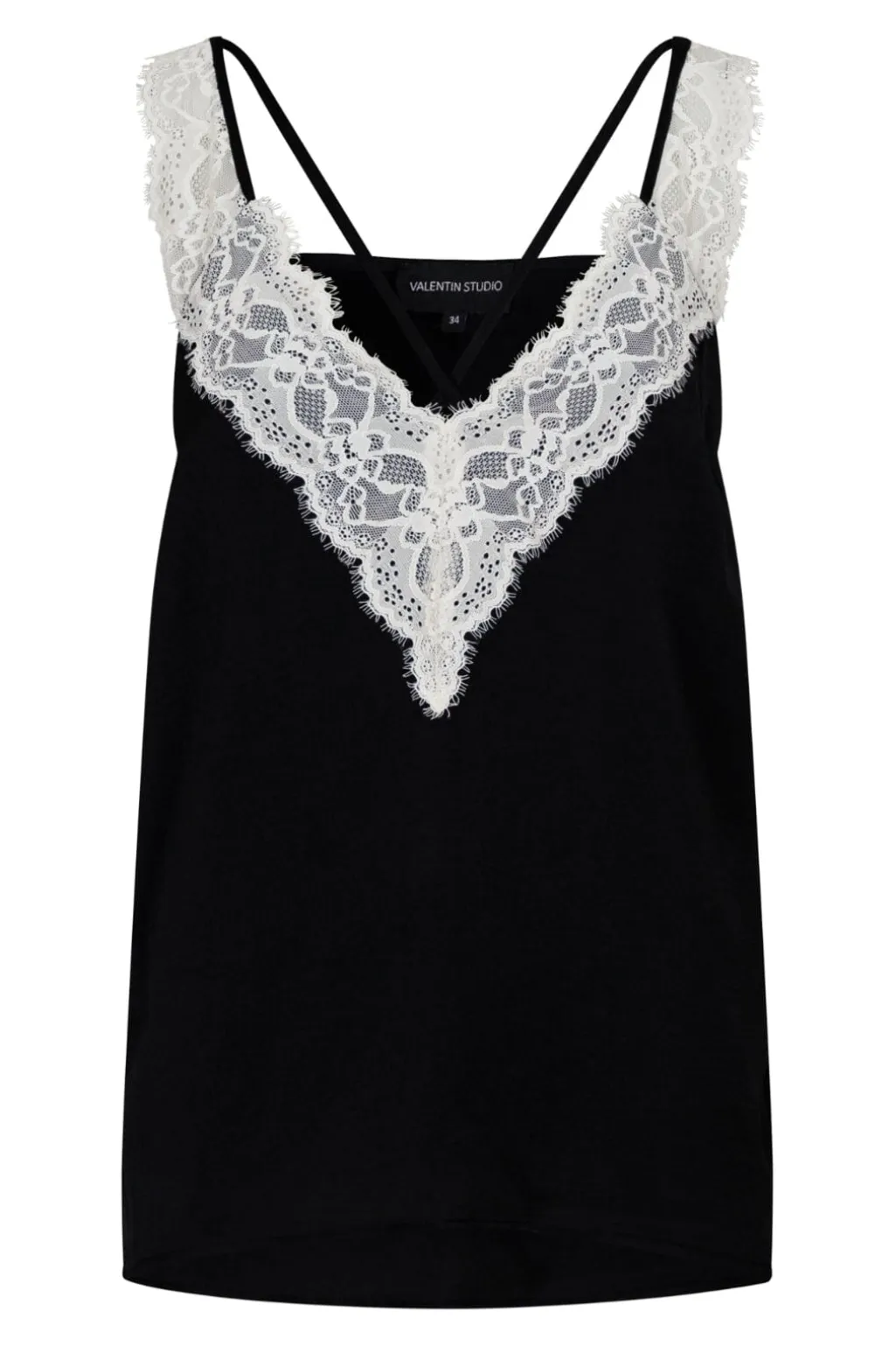 Sort top fra Valentin Studio med hvid blondekant langs V-udskæringen. De tynde stropper og blondedetaljerne giver toppen et feminint udtryk, der passer til både formelle og festlige anledninger.