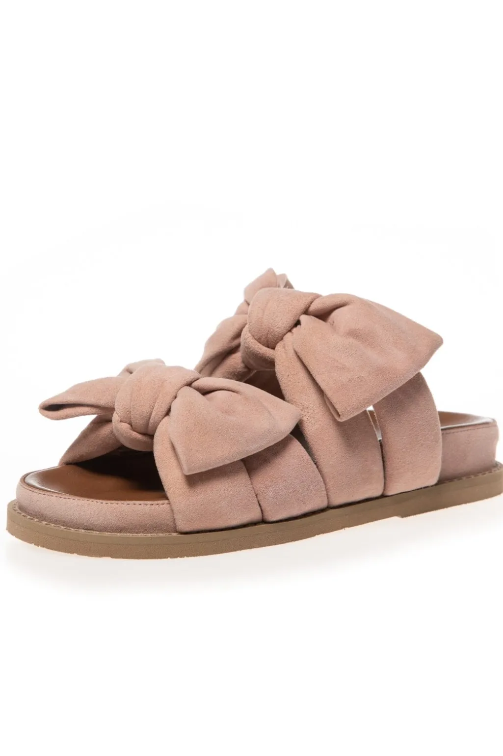 Sandaler fra Copenhagen Shoes i ruskind. Den lyse papayafarve og de store sløjfer på stropperne giver sandalerne et sommerligt udtryk.