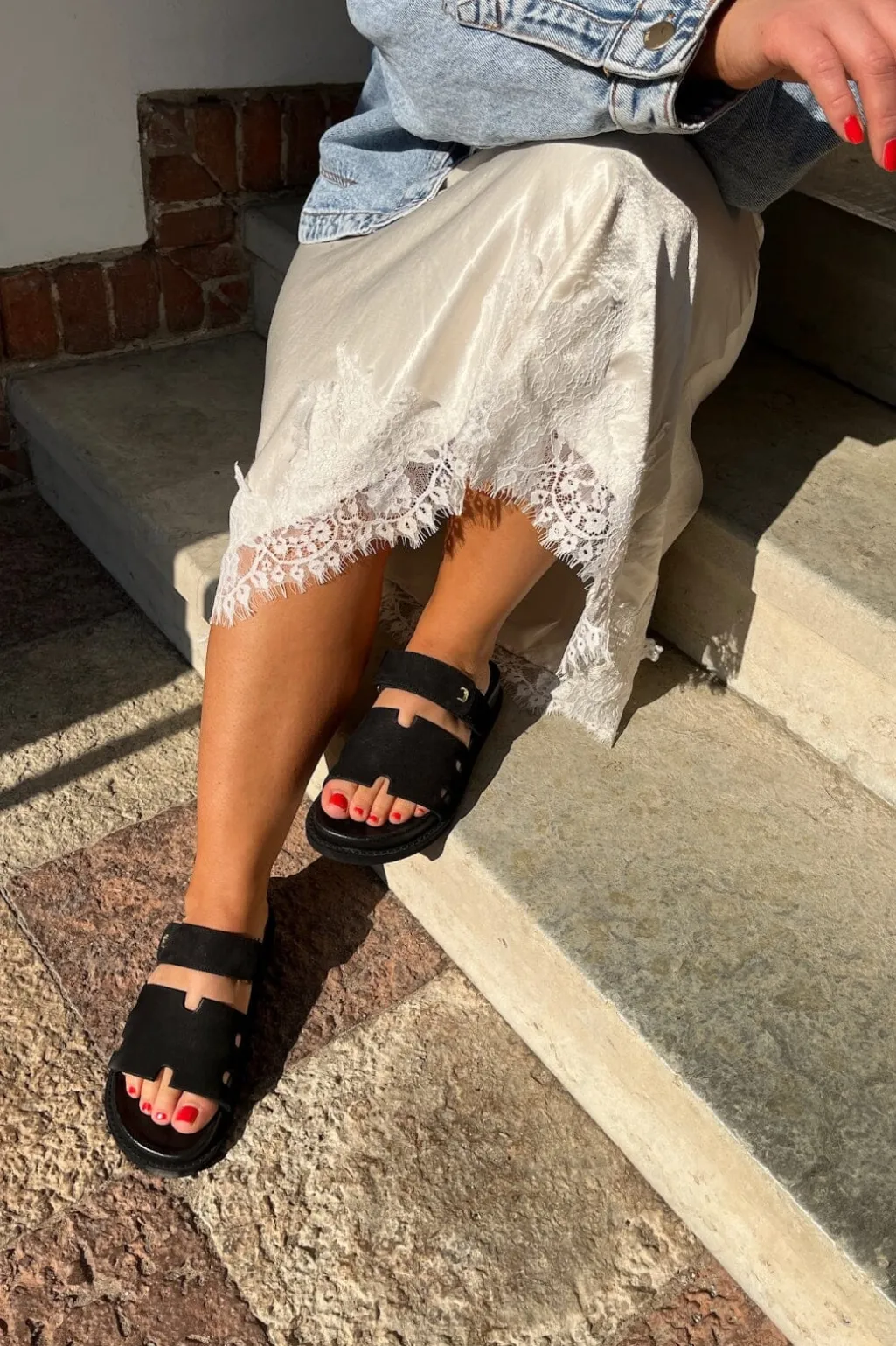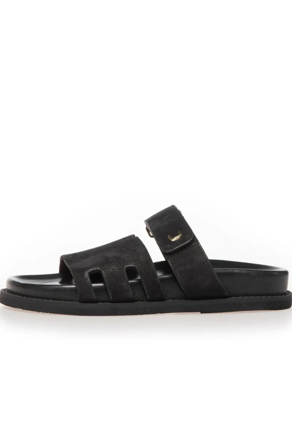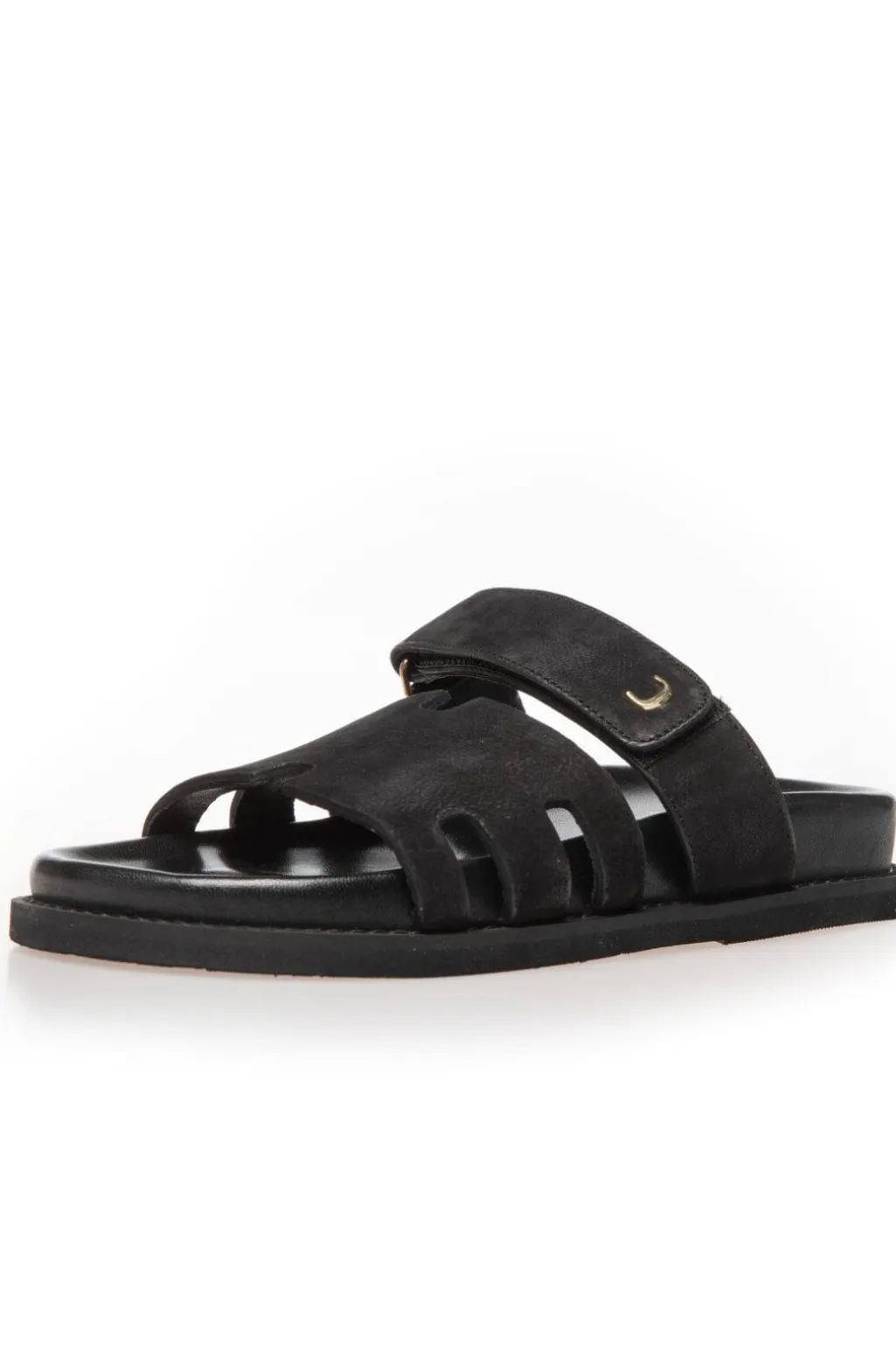 Sorte sandaler fra Copenhagen Shoes i ruskind. Sandalerne har både velcro og spænde som lukning, og de passer til både hverdag og fest.