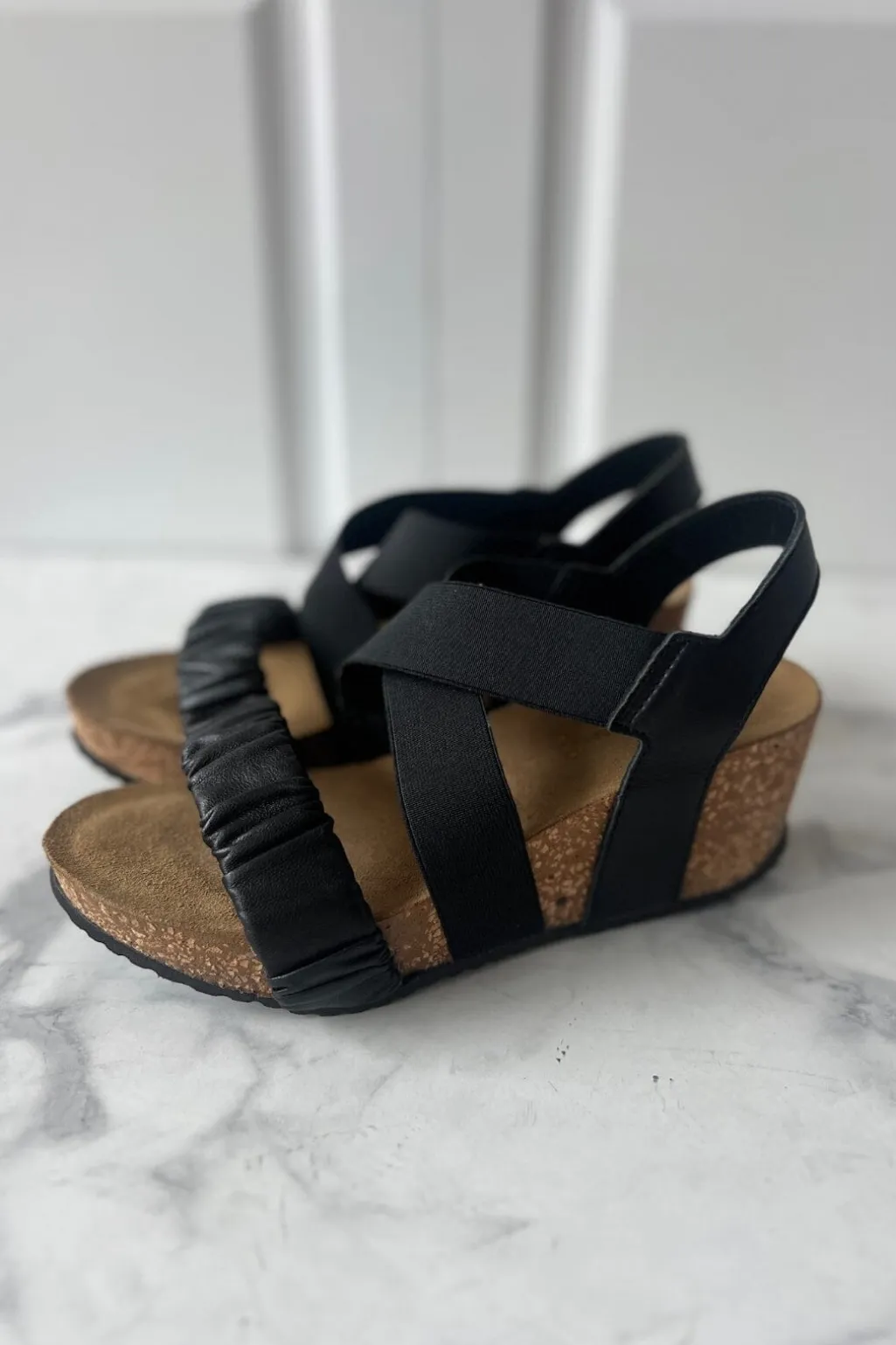 Sorte sandaler fra Copenhagen Shoes med krydsremme og korklignende sål. Sandalerne kombinerer ruskind og læder med en wedge-hæl, der giver god støtte.