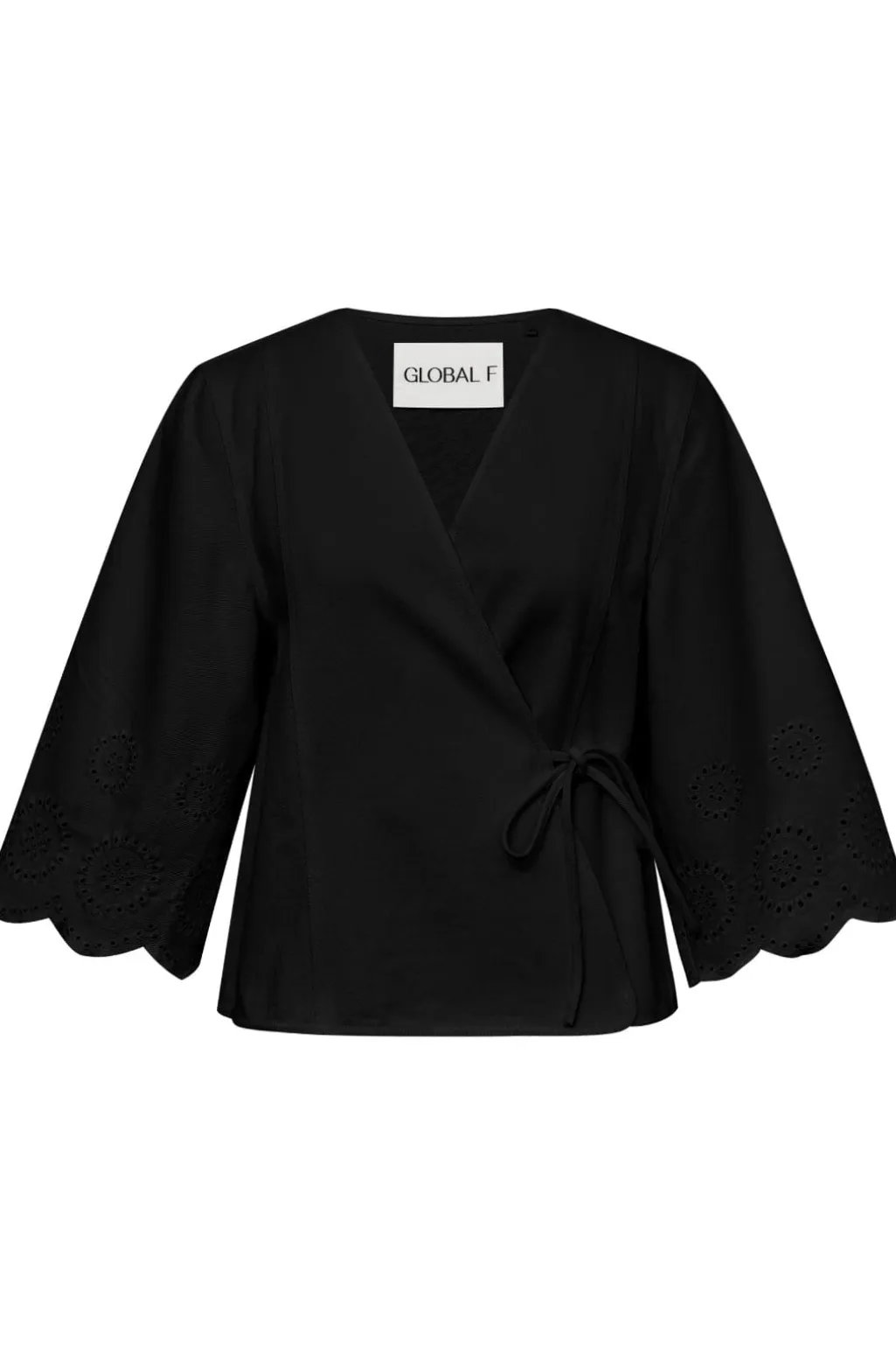 Sort wrap-top fra Global Funk i bomuld. Toppen har 3/4-ærmer med scallop-kant og V-halsudskæring. Bindebåndet i taljen giver mulighed for at tilpasse pasformen.