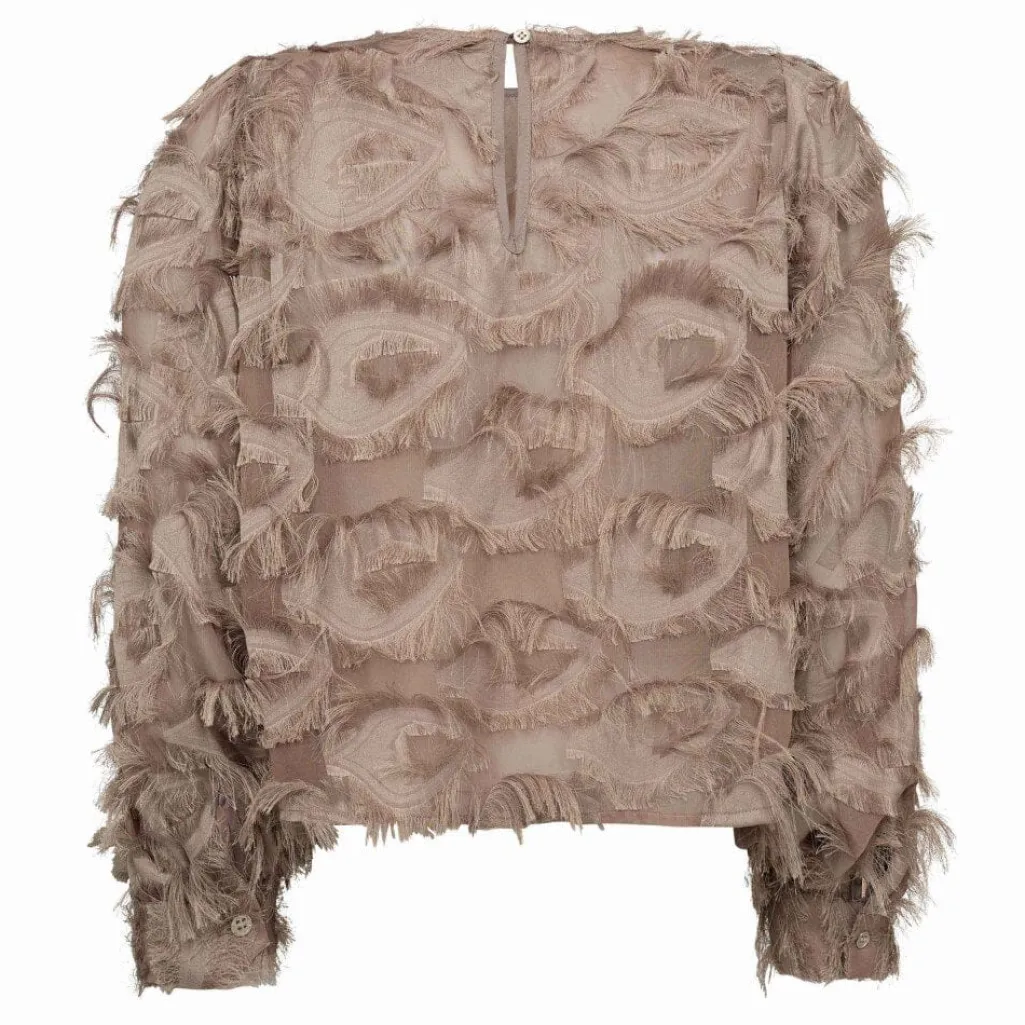 Brun bluse fra Co’Couture i valnødfarvet polyester. Blusen har en struktureret overflade med lag af ruflede detaljer og lange ærmer med rund halsudskæring.
