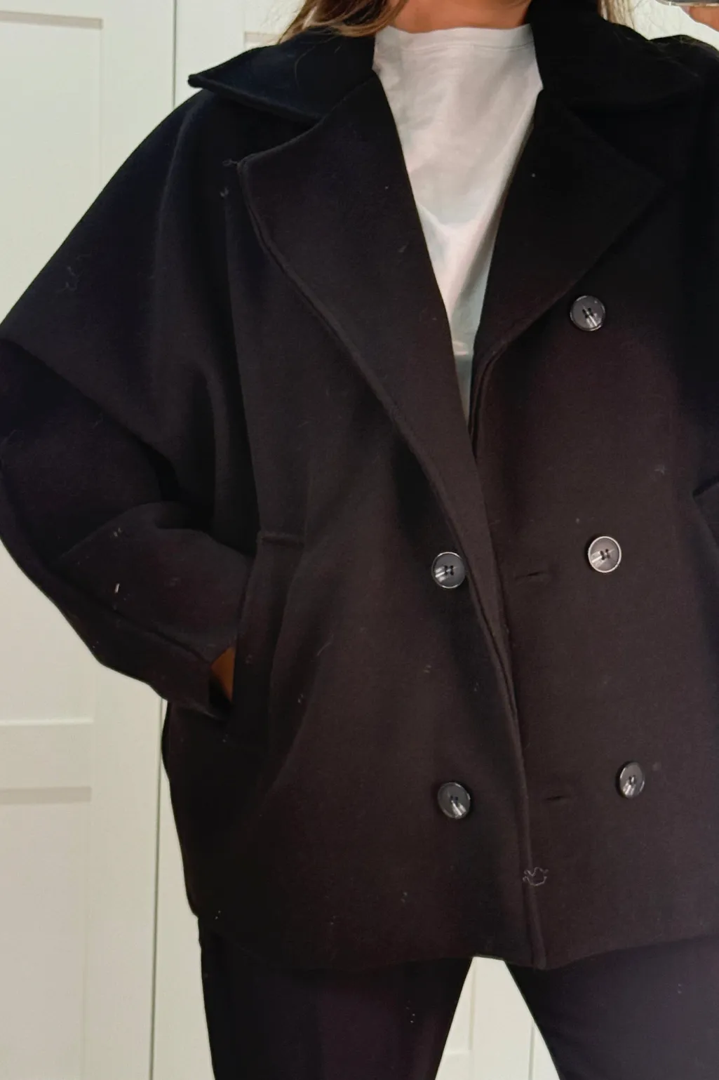 Sort jakke fra A-bee med dobbeltradet design og løs pasform. Jakken har store knapper og en bred krave i et klassisk snit.