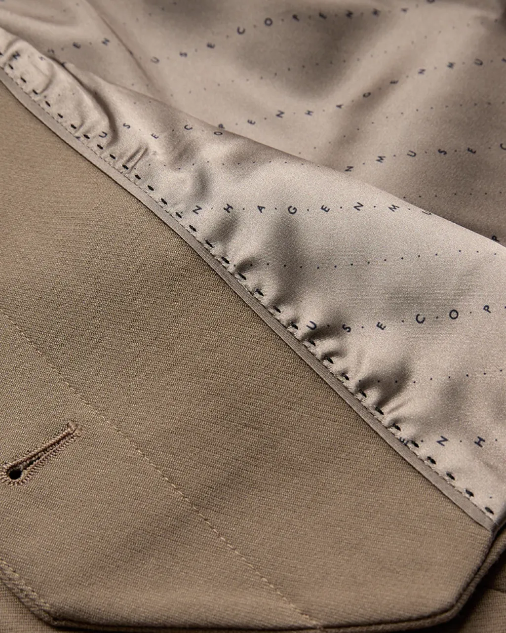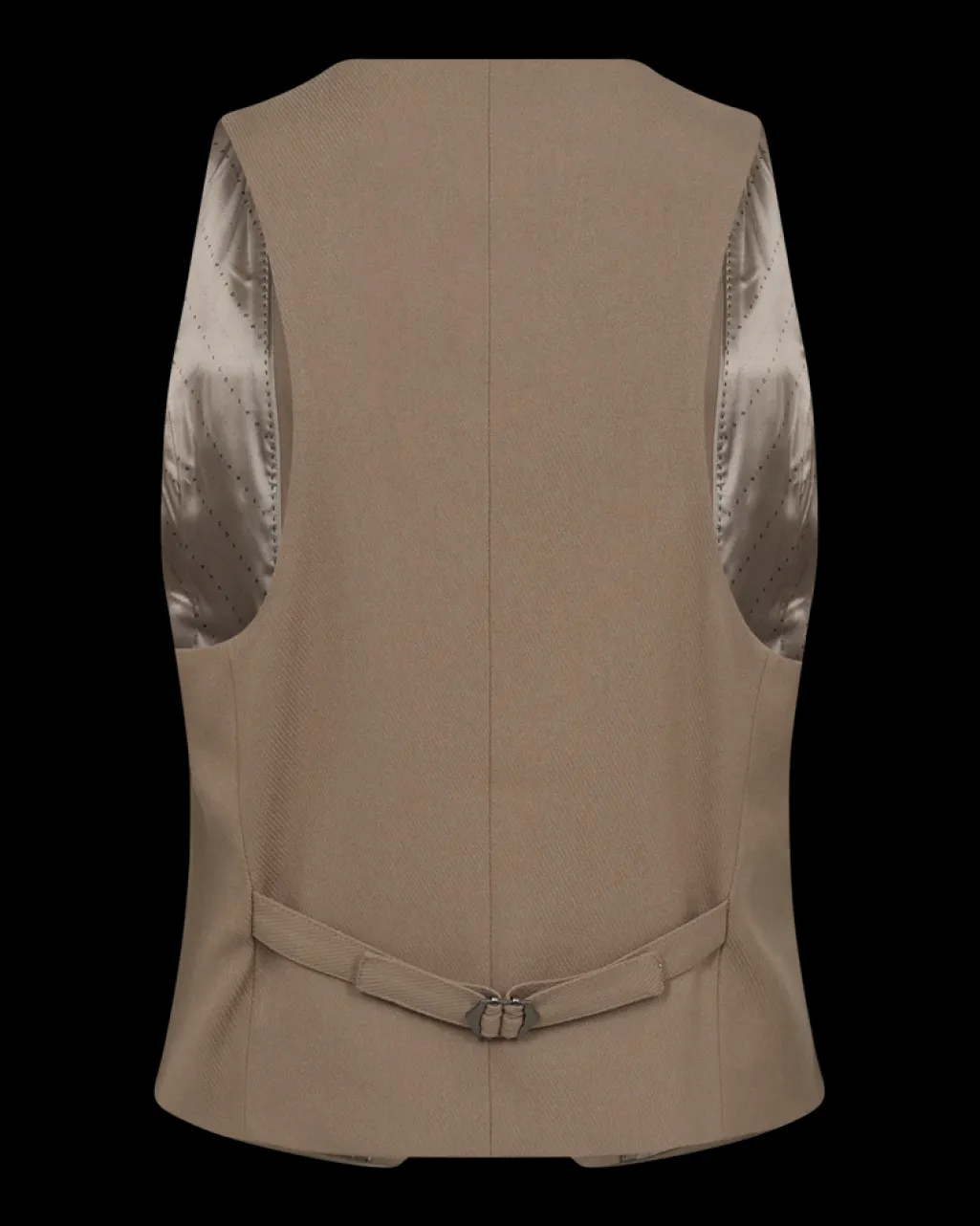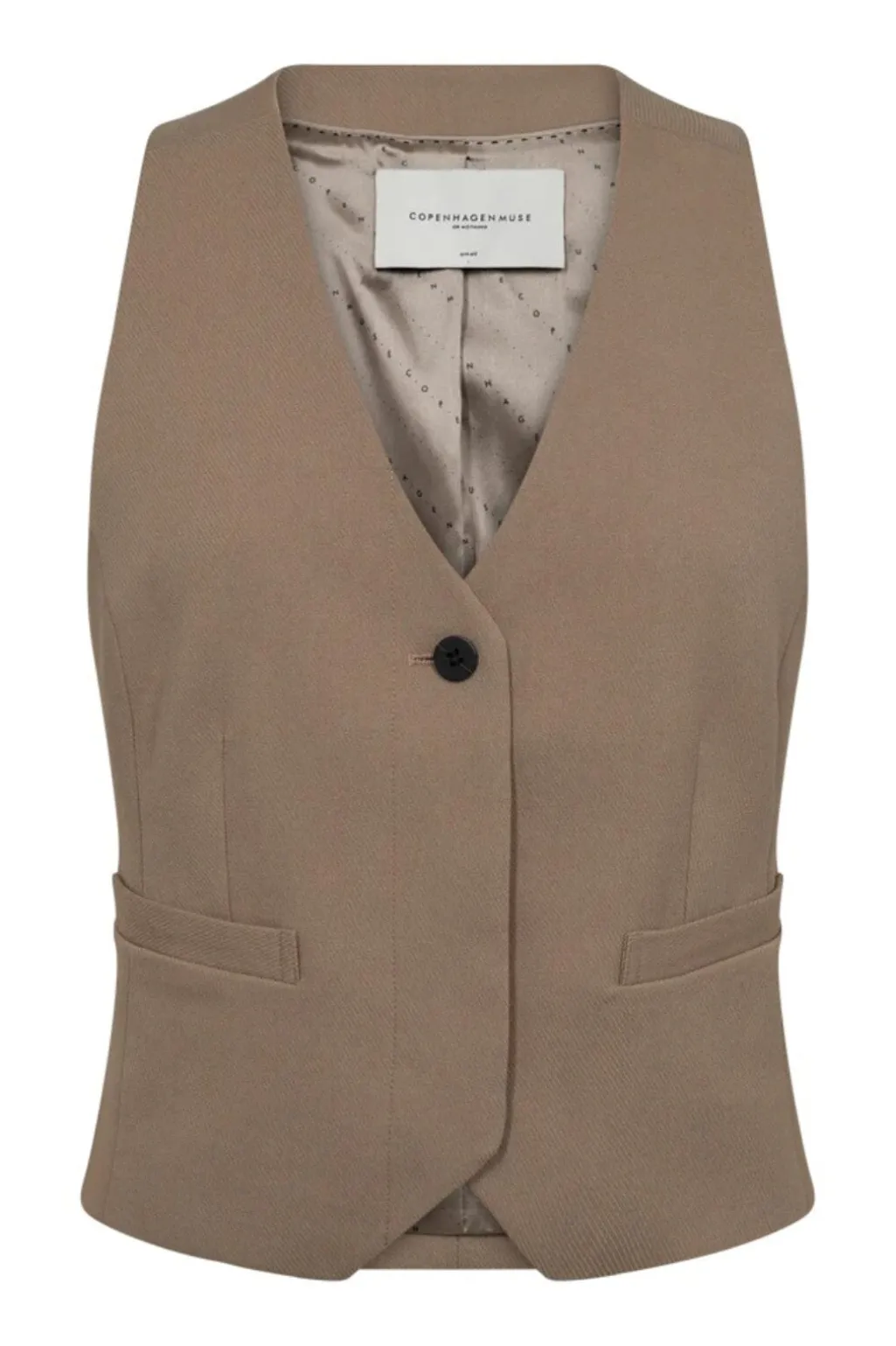 Vest fra Copenhagen Muse i Timber Wolf-farven. En klassisk vest med V-hals og enkel knaplukning foran. To praktiske forlommer og en glat bagside giver vesten et rent udtryk.