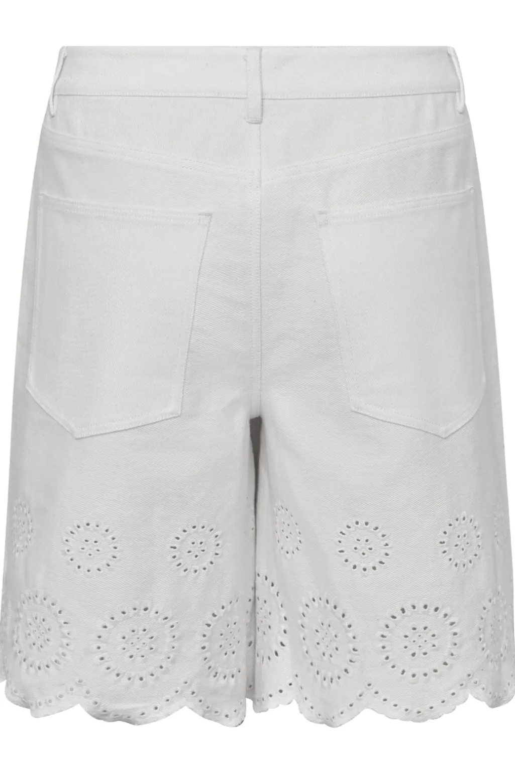 Hvide shorts fra Global Funk med scallop-kant og blomsterudskæringer langs bunden. Shortsene har lynlås og knapper i front samt lommer både foran og bagpå.