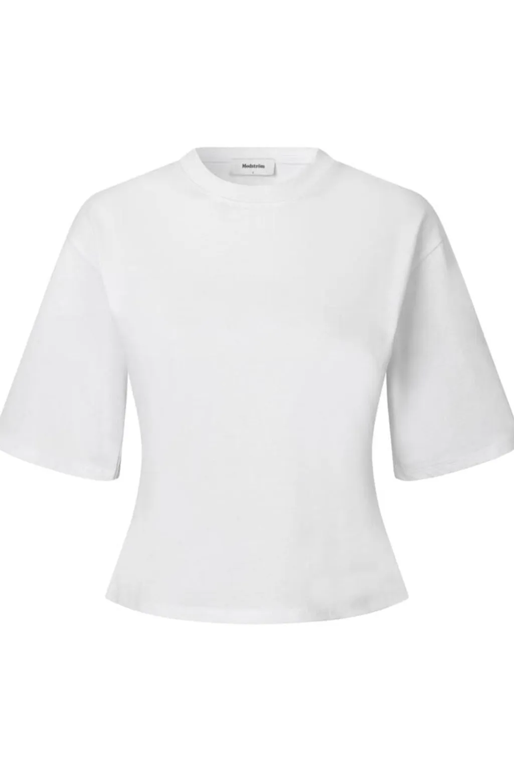 Hvid t-shirt fra Modström i økologisk bomuld. T-shirten har en figursyet pasform med brede, korte ærmer og en rund halsudskæring.