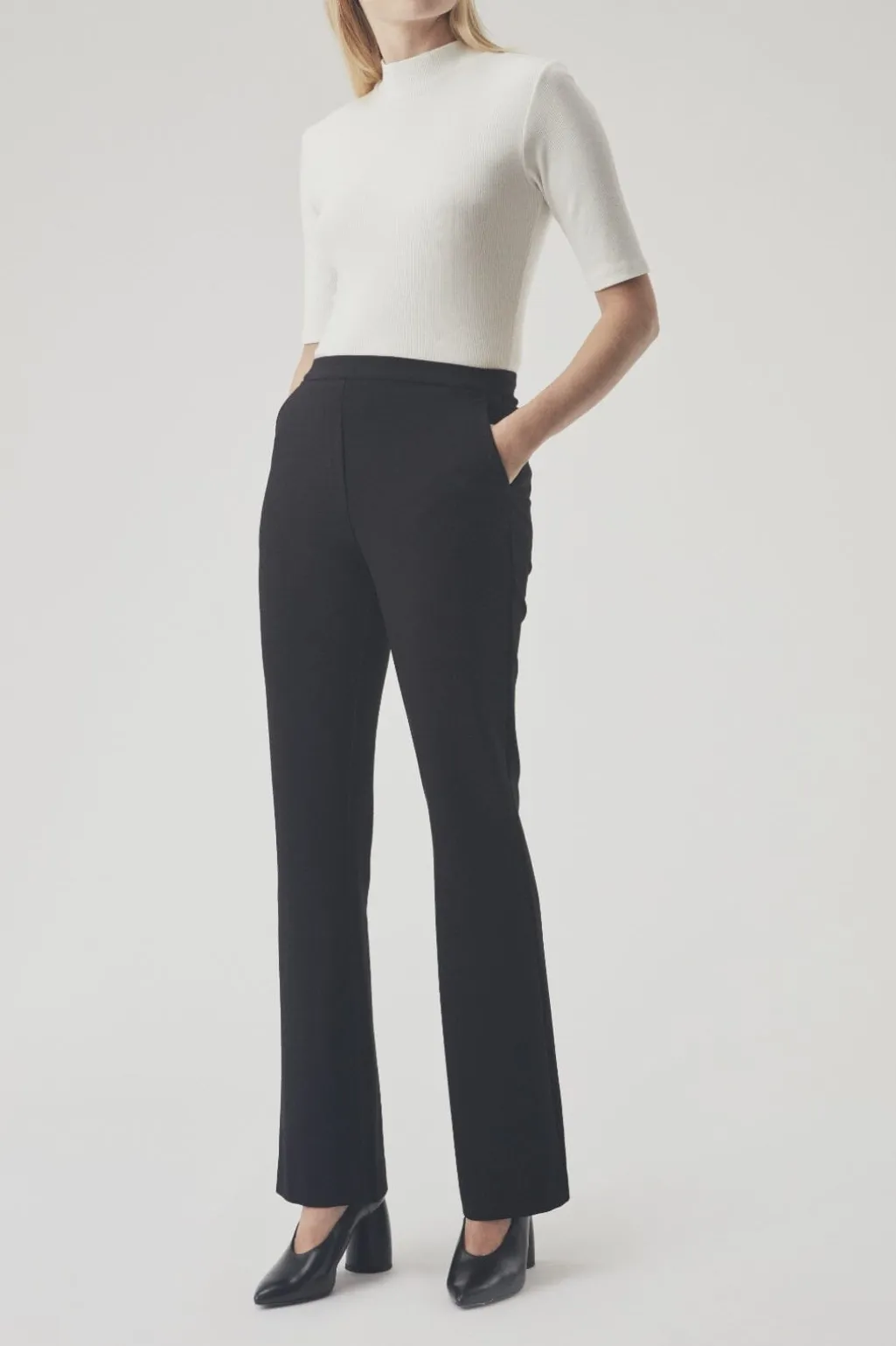 Sorte bukser fra Modström med svaj i benene. Bukserne har skrå lommer foran og en ankellængde, der gør dem nemme at style til både hverdag og fest.