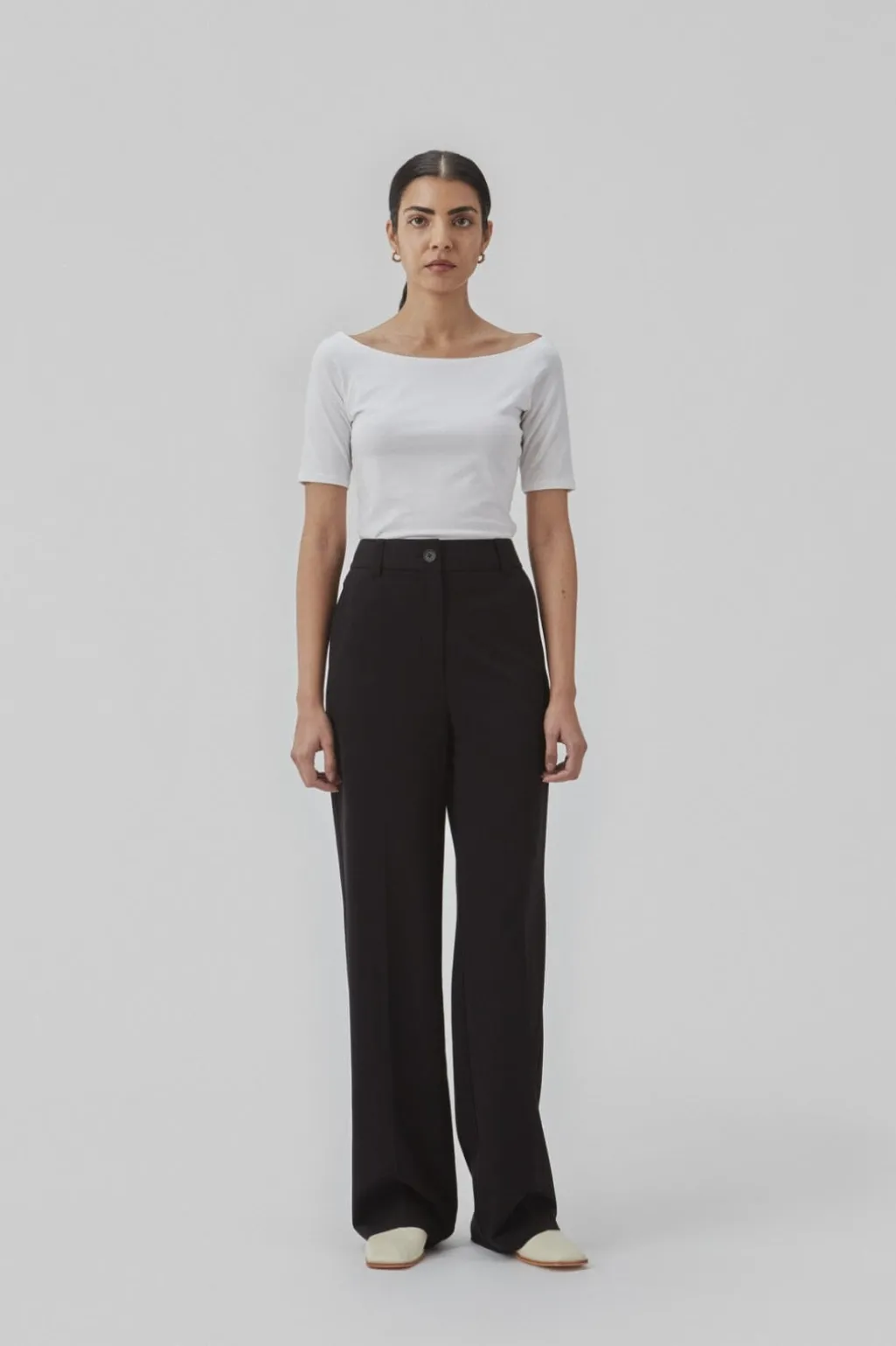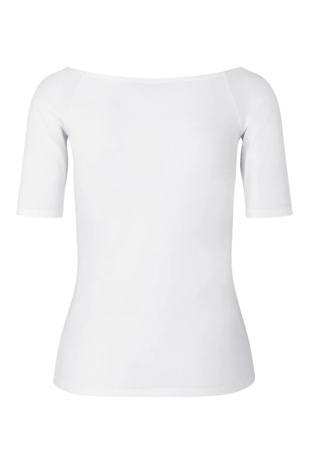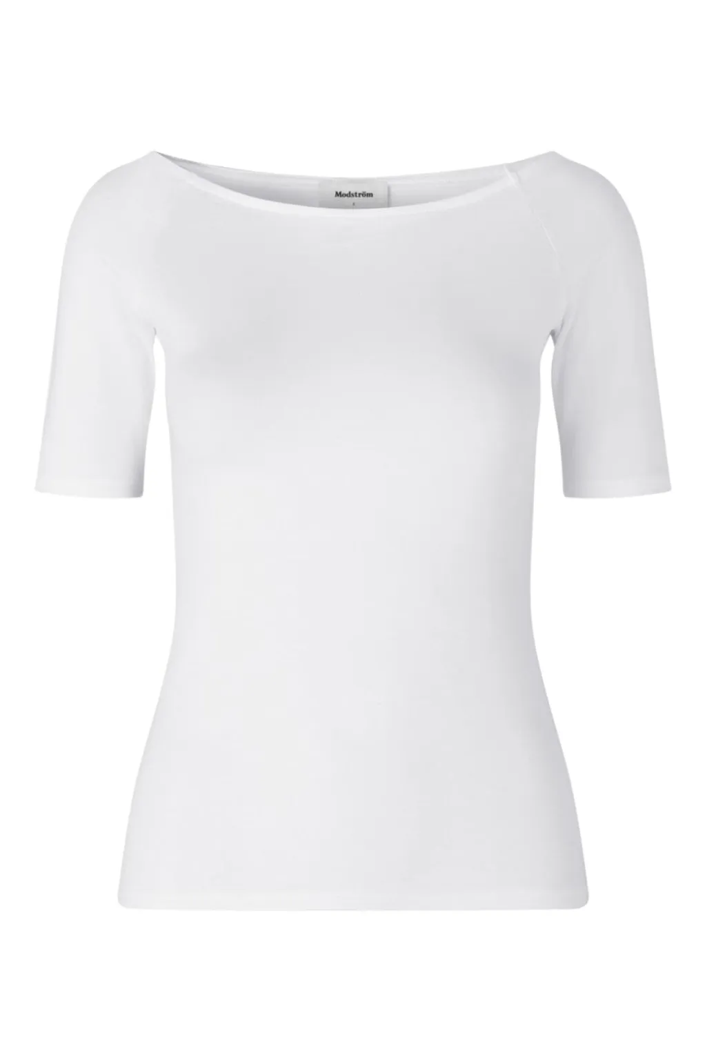 Hvid top fra Modström med bådudskæring både foran og bagpå. Toppen har en tætsiddende pasform og korte ærmer, der sidder tæt på armene.