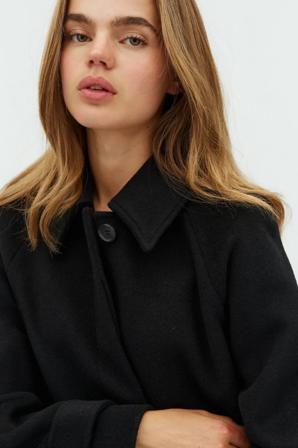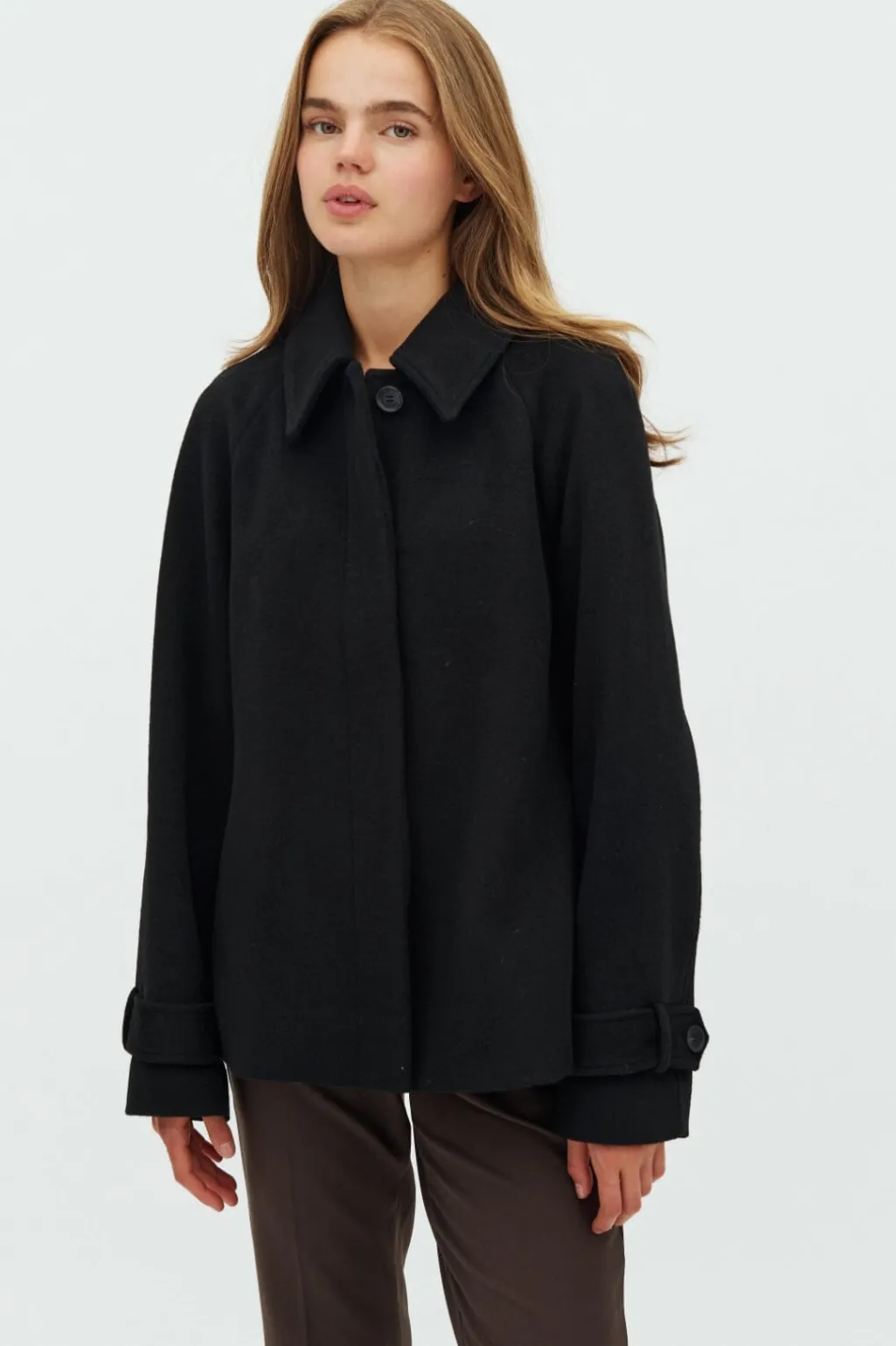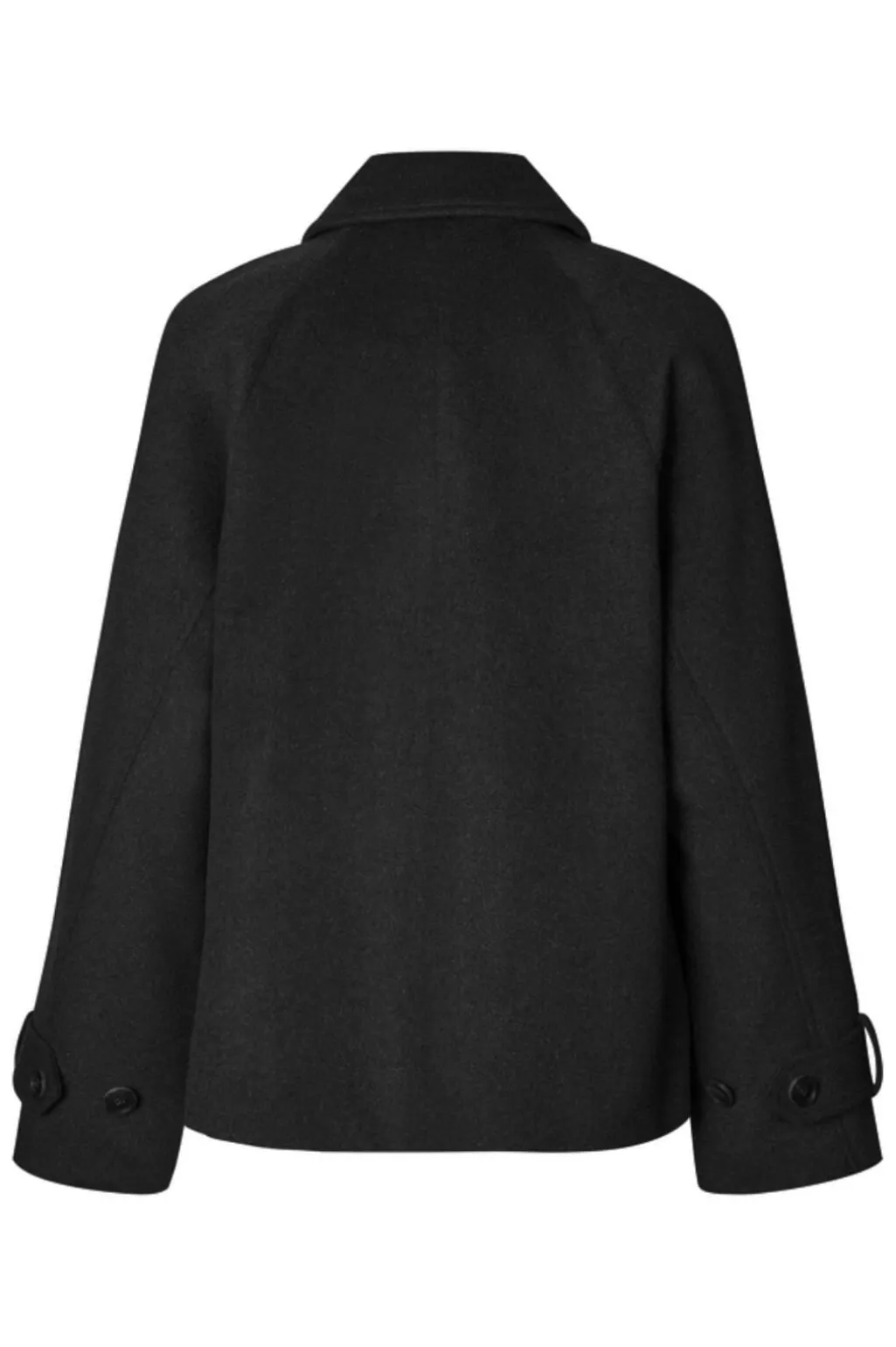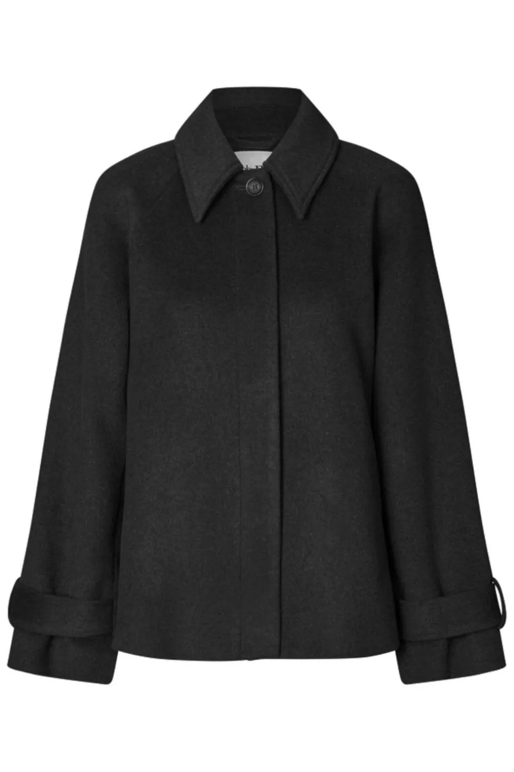 Sort jakke fra MbyM med klassisk krave og knaplukning. Jakken har justerbare manchetter med knapper og en sort farve.