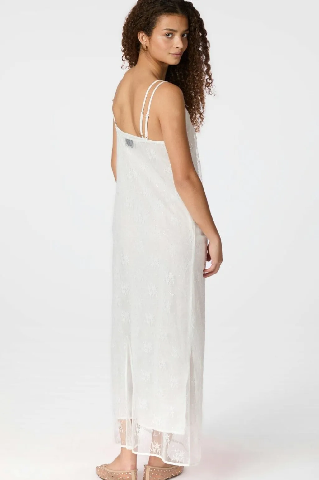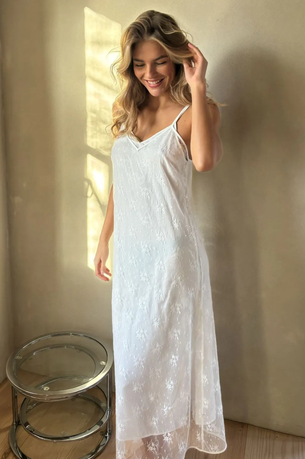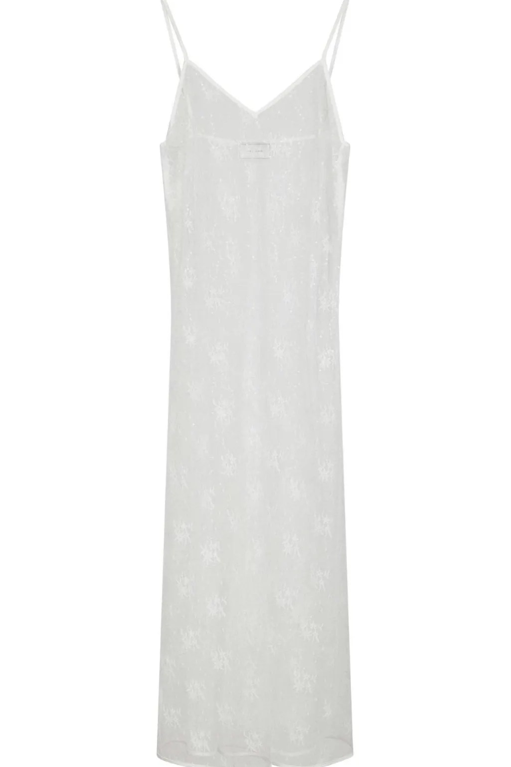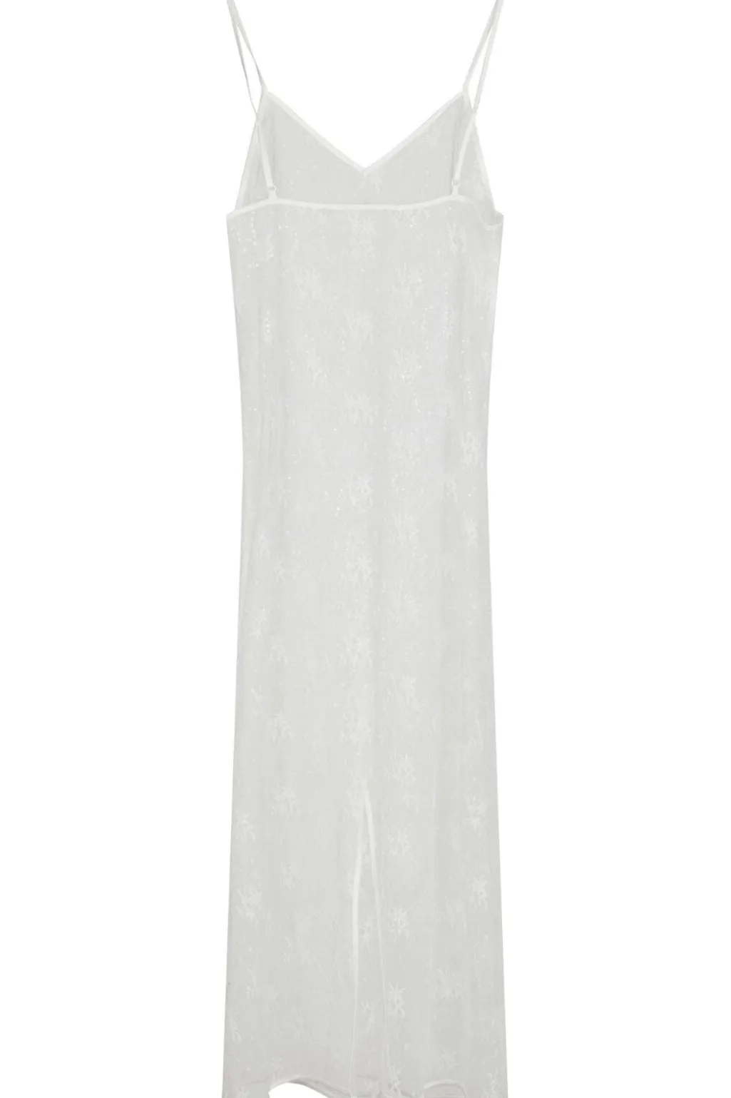 Hvid blondekjole fra Neo Noir med pailletter og gennemsigtigt stof. Kjolen har tynde stropper, V-udskæring og ankellængde. Blomstermønstret i blonden giver kjolen et romantisk præg.