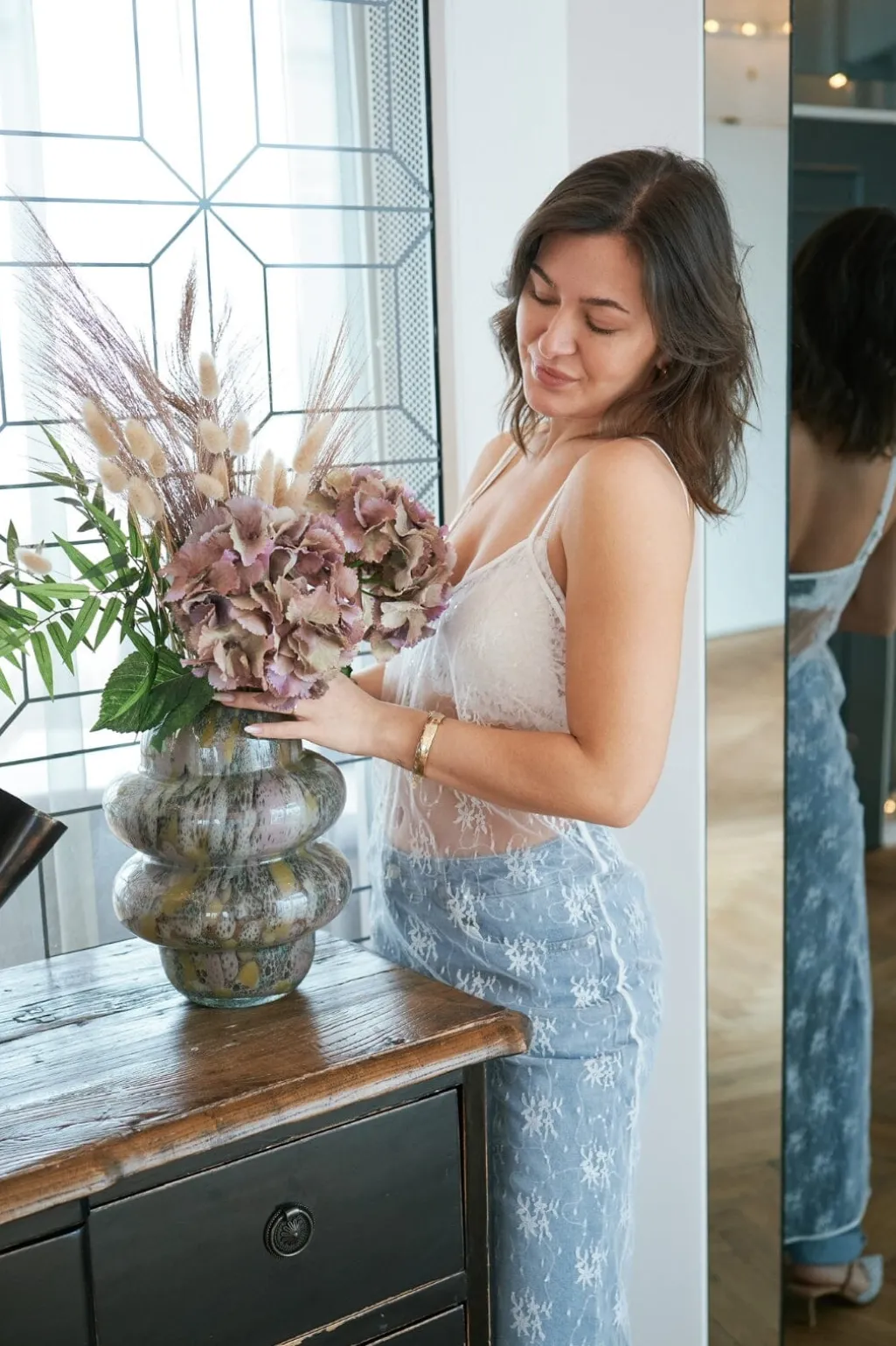 - Modellen er 176 cm høj og bærer størrelse 36
