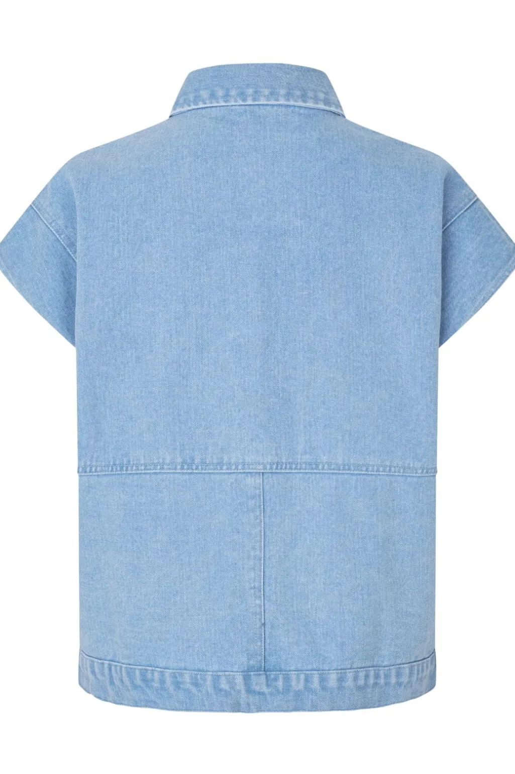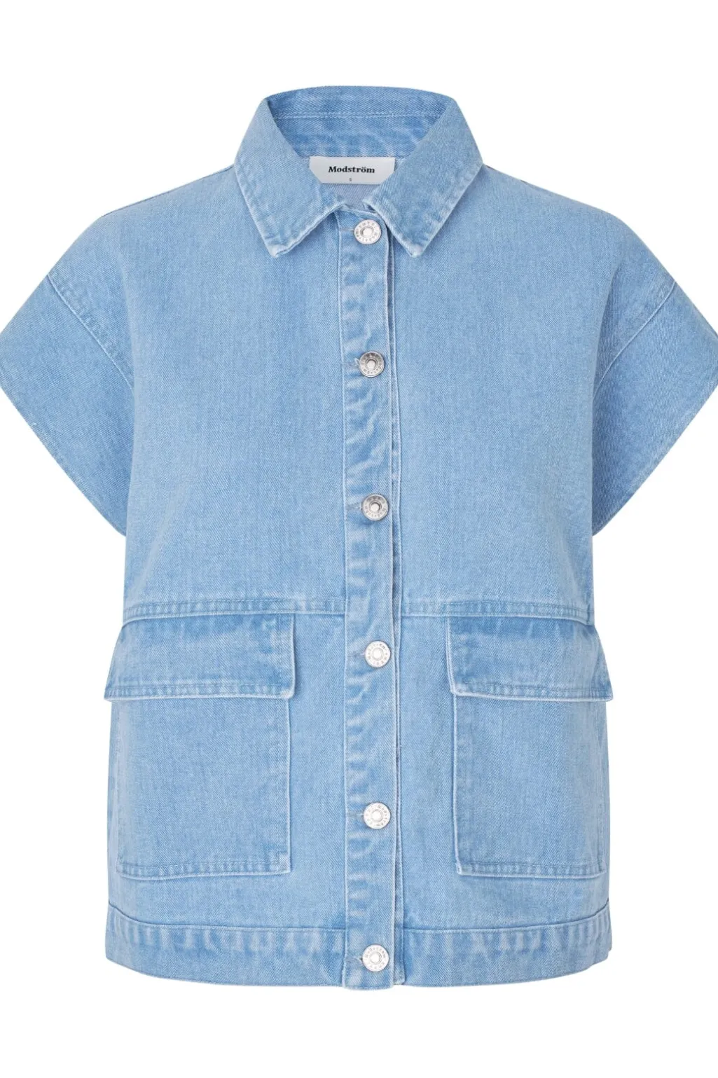 Denimblå vest fra Modström med skjortekrave og knaplukning. Vesten har en løs pasform og to praktiske forlommer på forsiden.