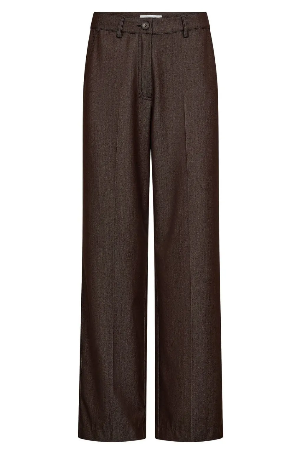 Mørkebrun bukser fra Co´Couture med en løs pasform og lang længde. Bukserne er lavet i en materialeblanding og har folder foran.