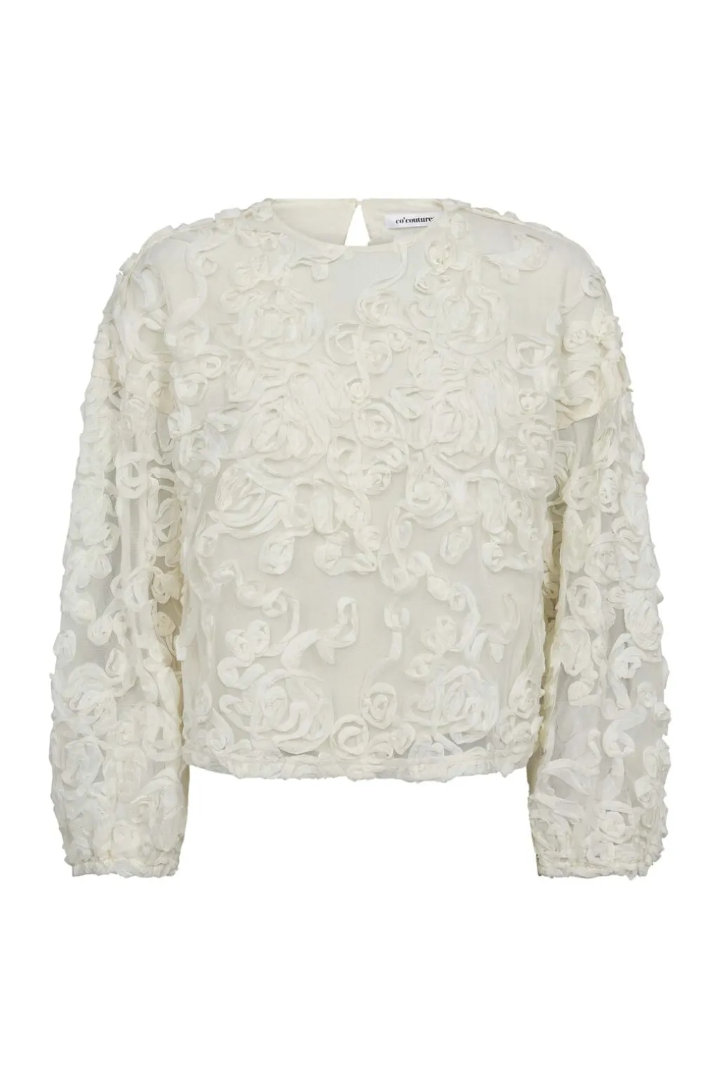 En cremefarvet bluse fra Co´Couture med et blomstret mønster over hele blusen. Blusen har flæsedetaljer og lange ærmer.