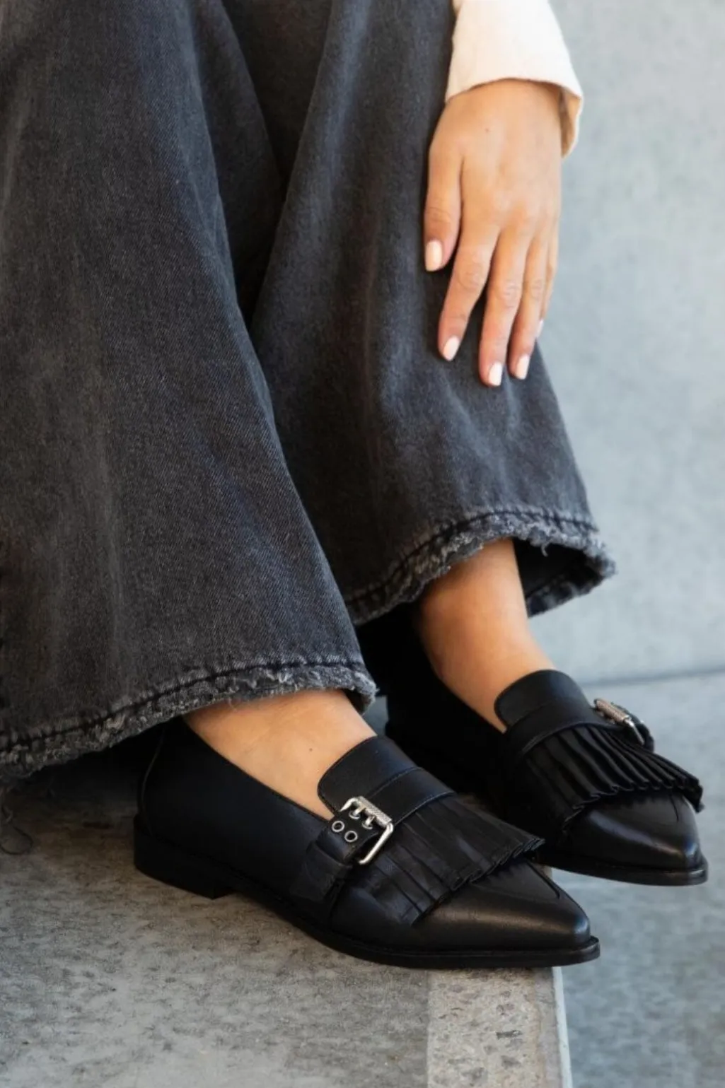 Sort lædersko med frynser og spænde fra Copenhagen Shoes. Den spidse tå og flade hæl giver skoen et klassisk udtryk, der passer til både kontoret og festen.