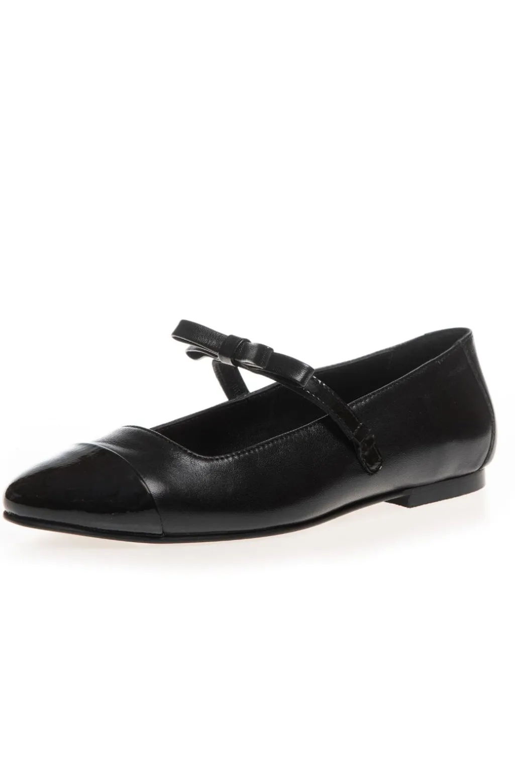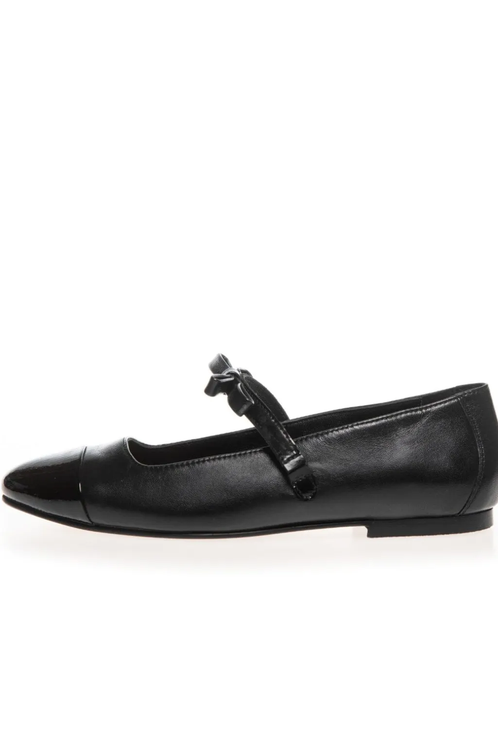 Sort ballerina-sko fra Copenhagen Shoes med spids tå. Lavet af læder med blank snude og mat overdel. Remmen over vristen giver god støtte.