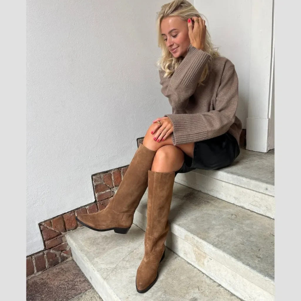Støvle fra Copenhagen Shoes i blødt ruskind med cognacfarvet overflade. Den spidse snude og den stabile hæl giver støvlen et rent og enkelt udtryk.