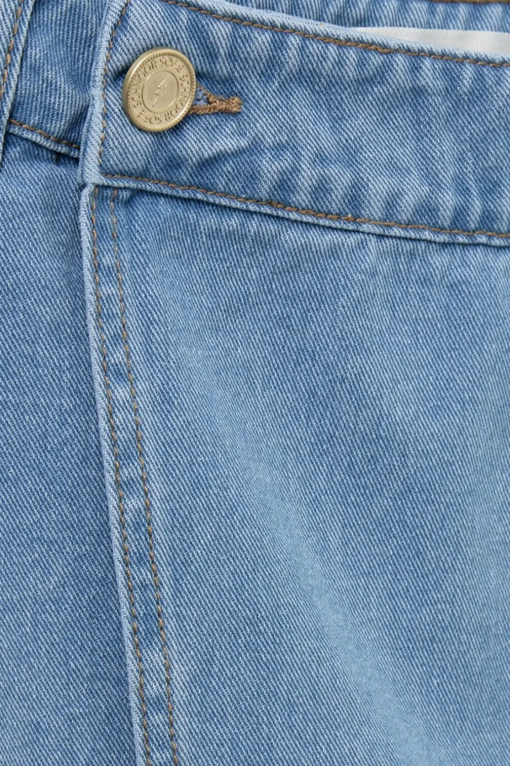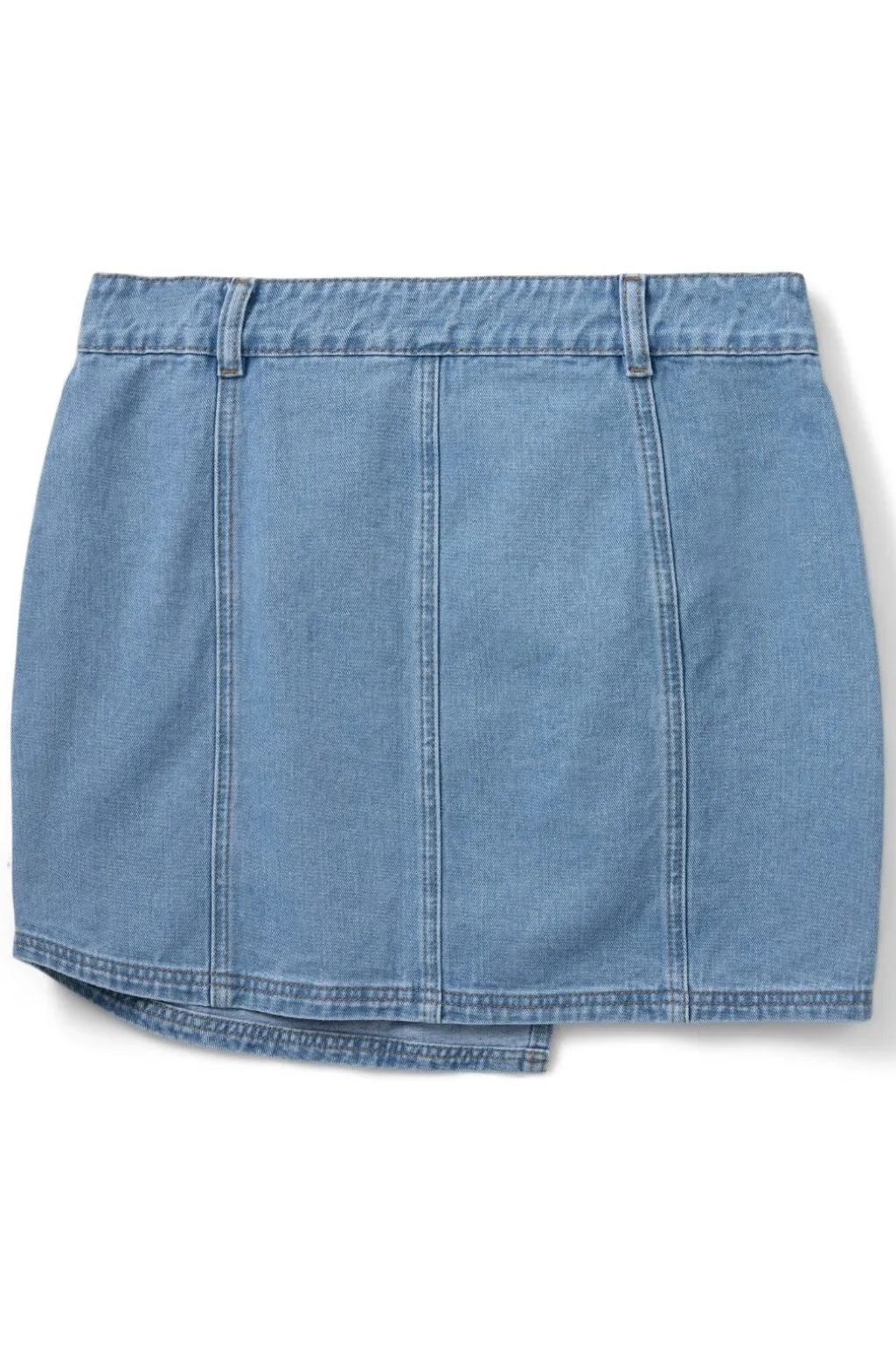 Denimnederdel i klassisk blå med asymmetrisk design. Den har dekorative syninger og knapper som lukning, der giver et maritimt præg. Nederdelen har en regulær taljehøjde.