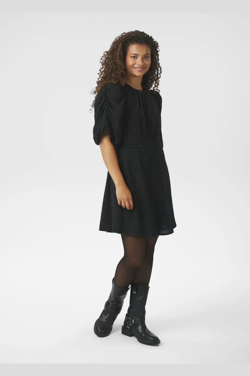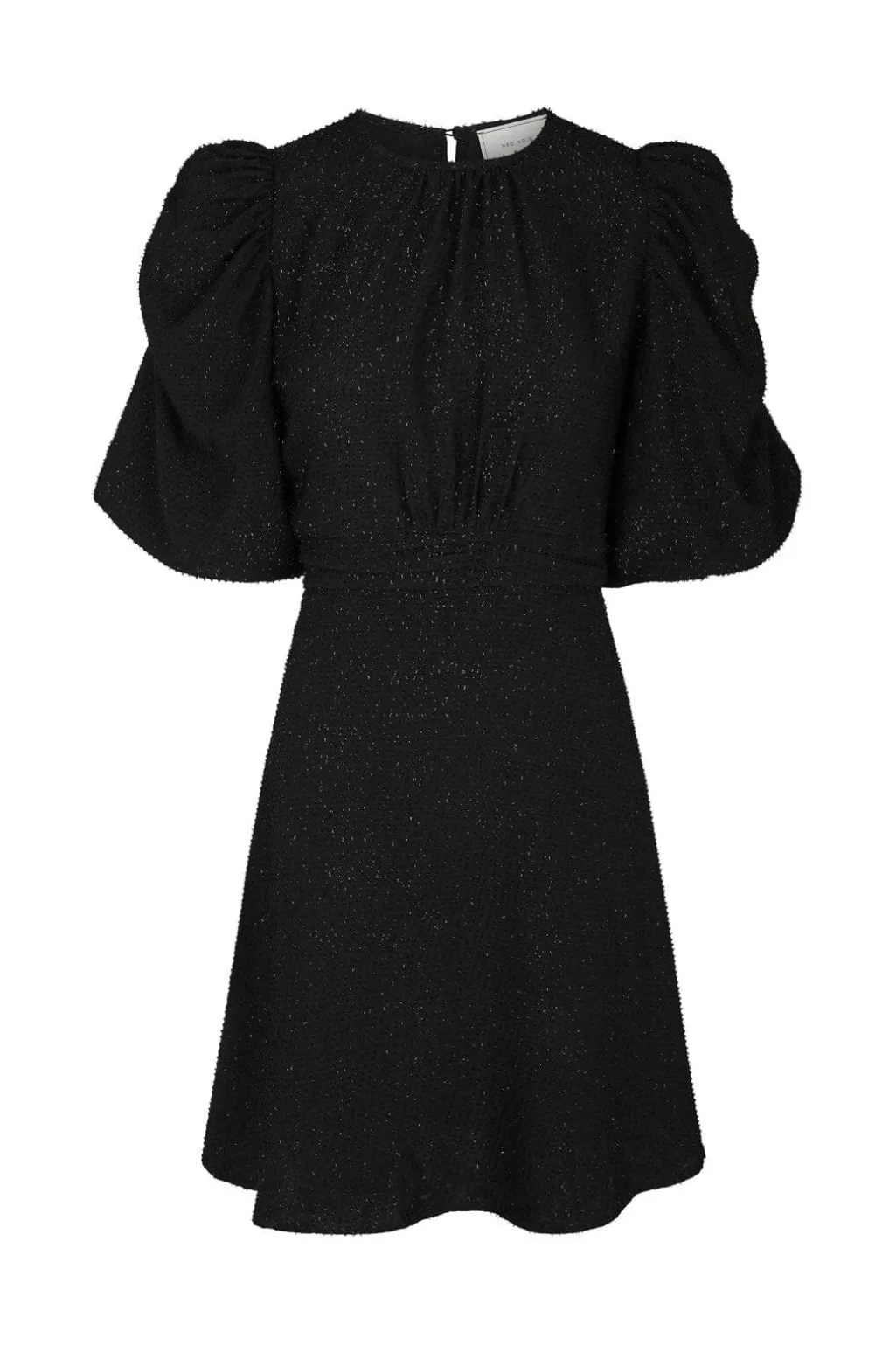 Sort festkjole fra Neo Noir med glitrende print over hele stoffet. Kjolen har pufærmer i 3/4-længde og en smockkant i taljen, der giver form til silhuetten.