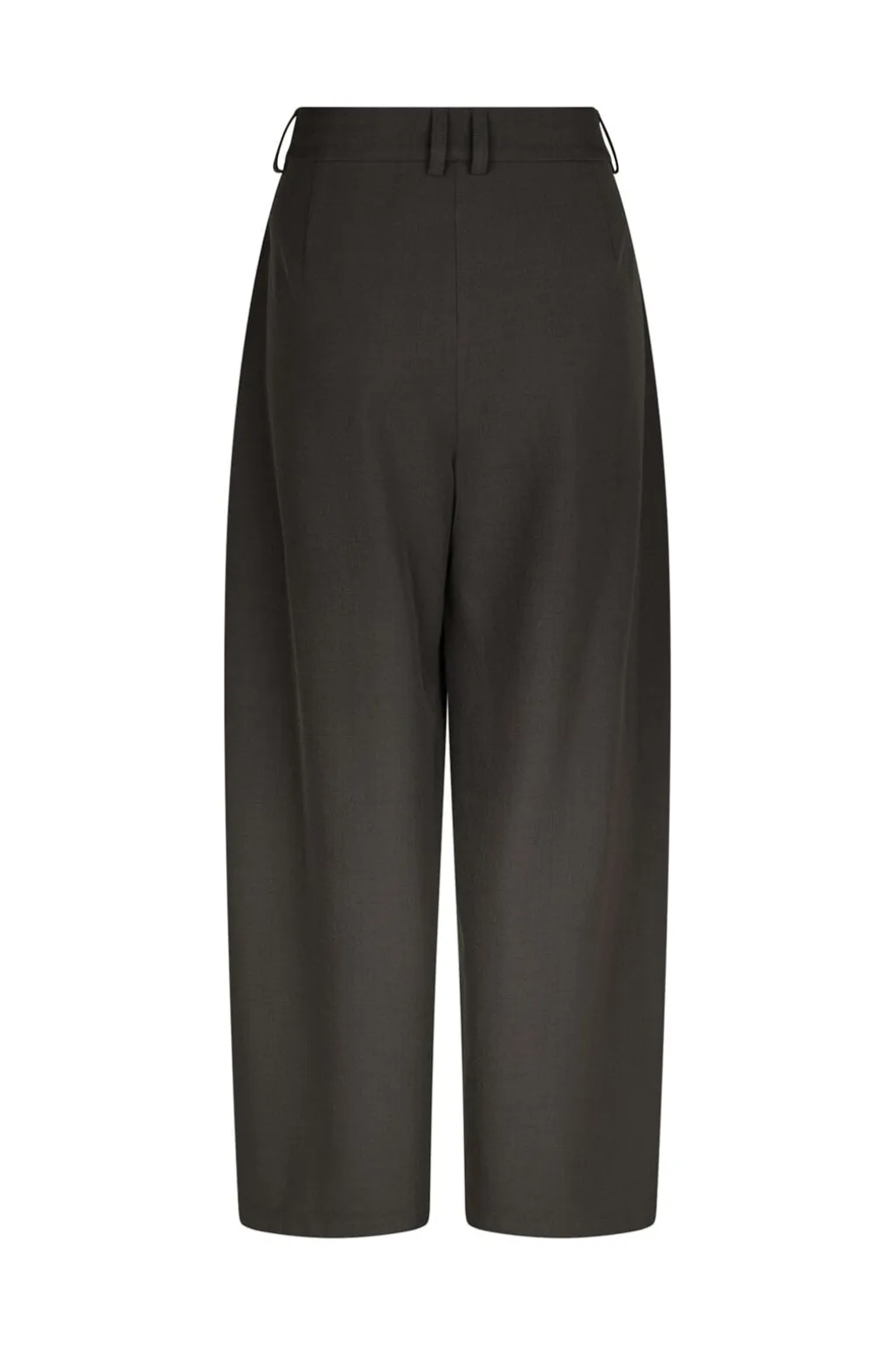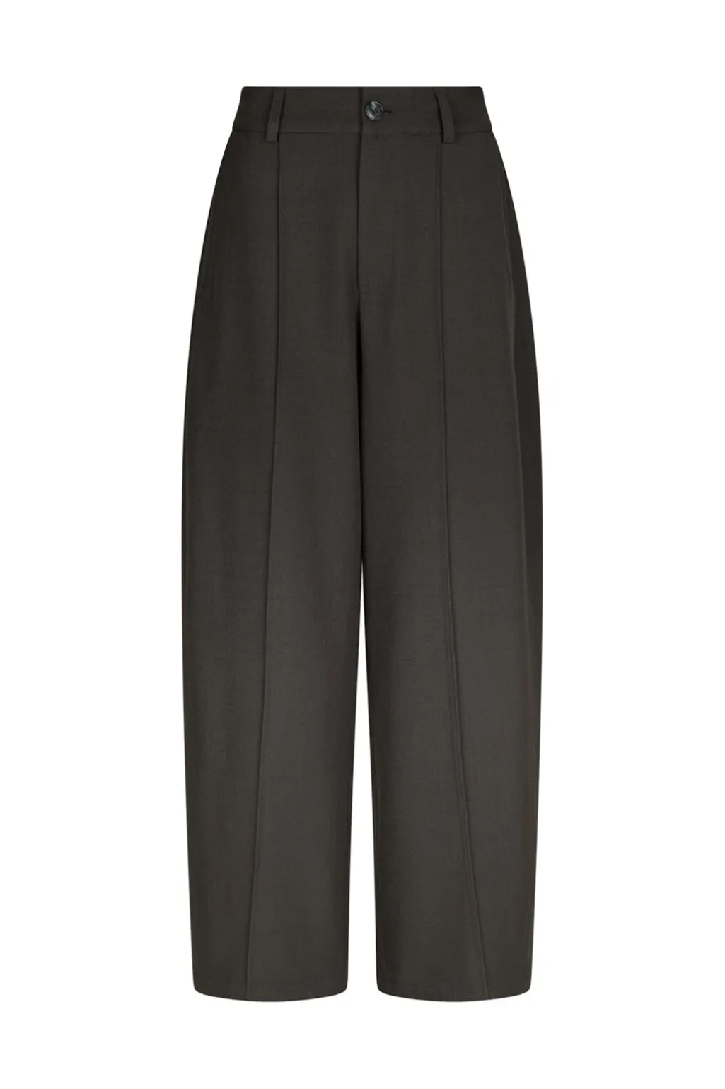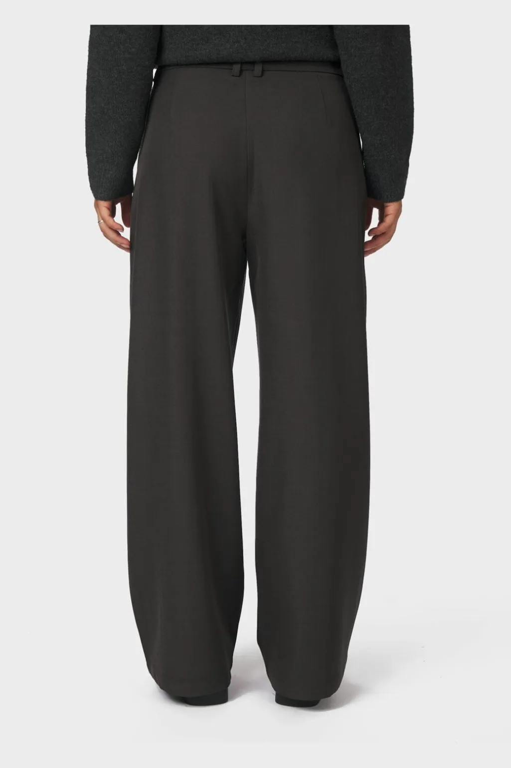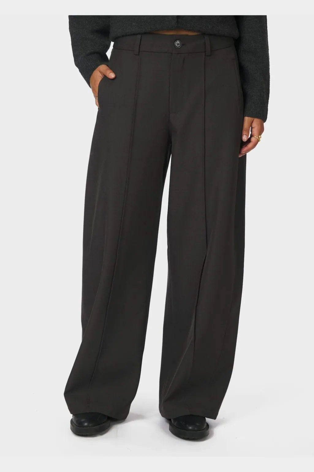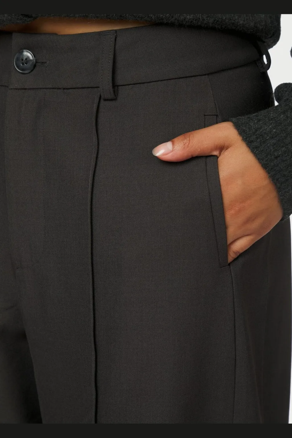 Mørkegrå bukser fra Neo Noir med mellemhøj talje og bueformede ben. Bukserne har en løs pasform og går ned til gulvet med pressefolder foran.