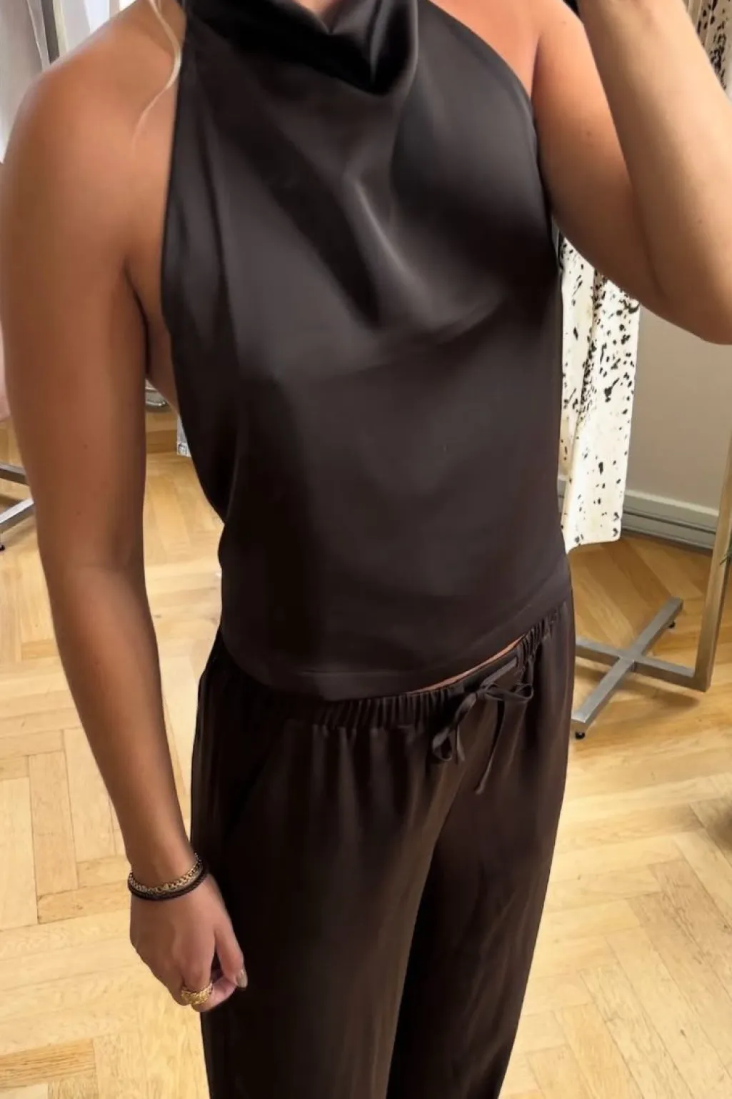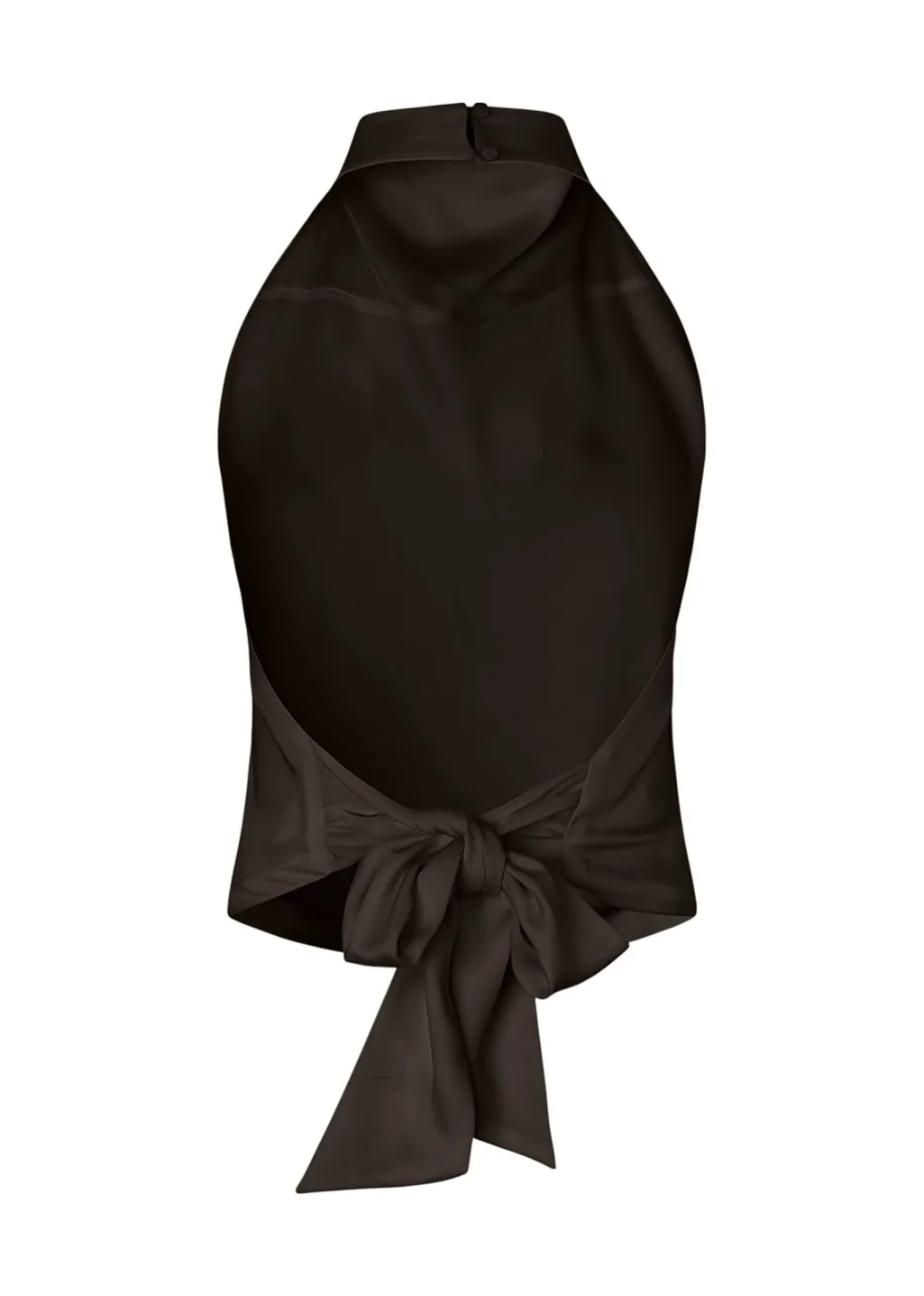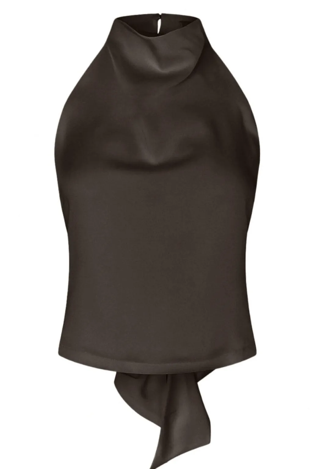 Brun halterneck-top fra Modström, lavet af satinlignende polyester med elastan. Toppen har en høj hals, åben ryg med bindebånd og knappelukning i nakken.
