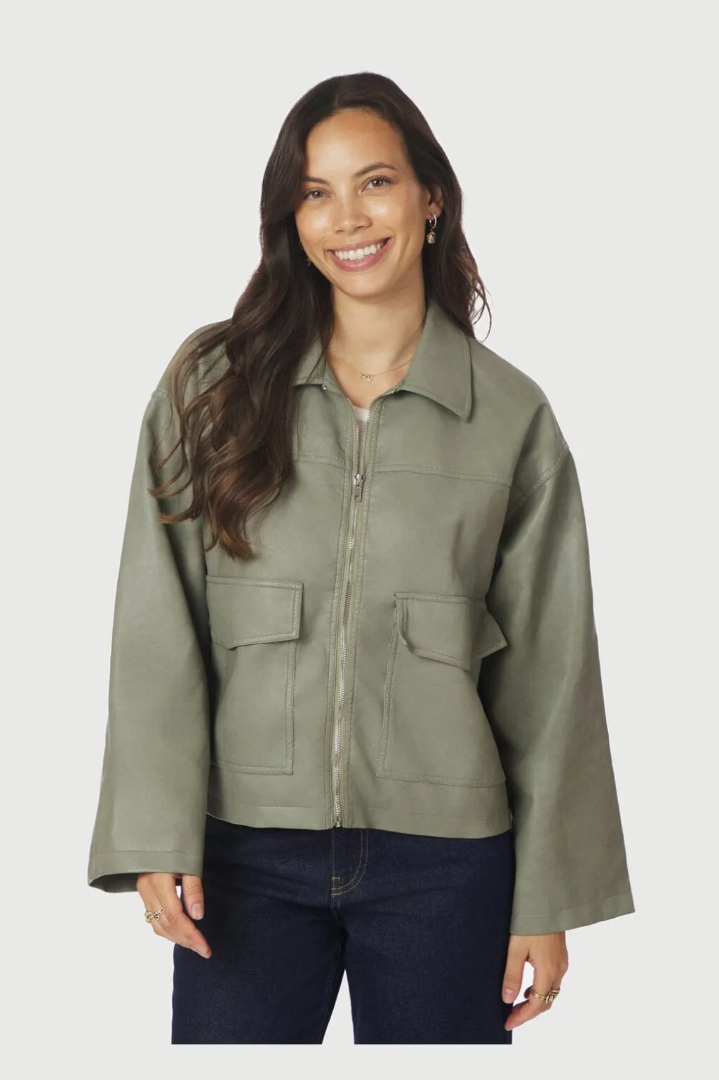 Faux læderjakke fra Neo Noir i blød grøn nuance. Jakken har en oversize pasform med skjortekrave og lynlås foran. To store lommer med klap på forsiden giver jakken et praktisk design.