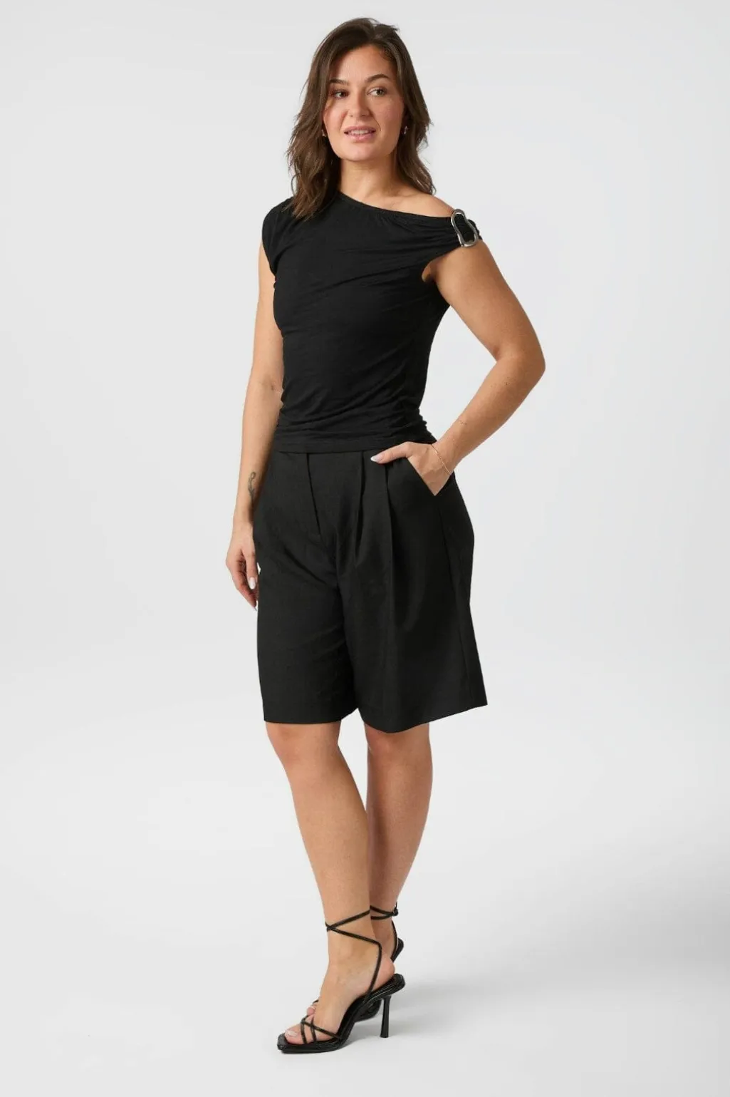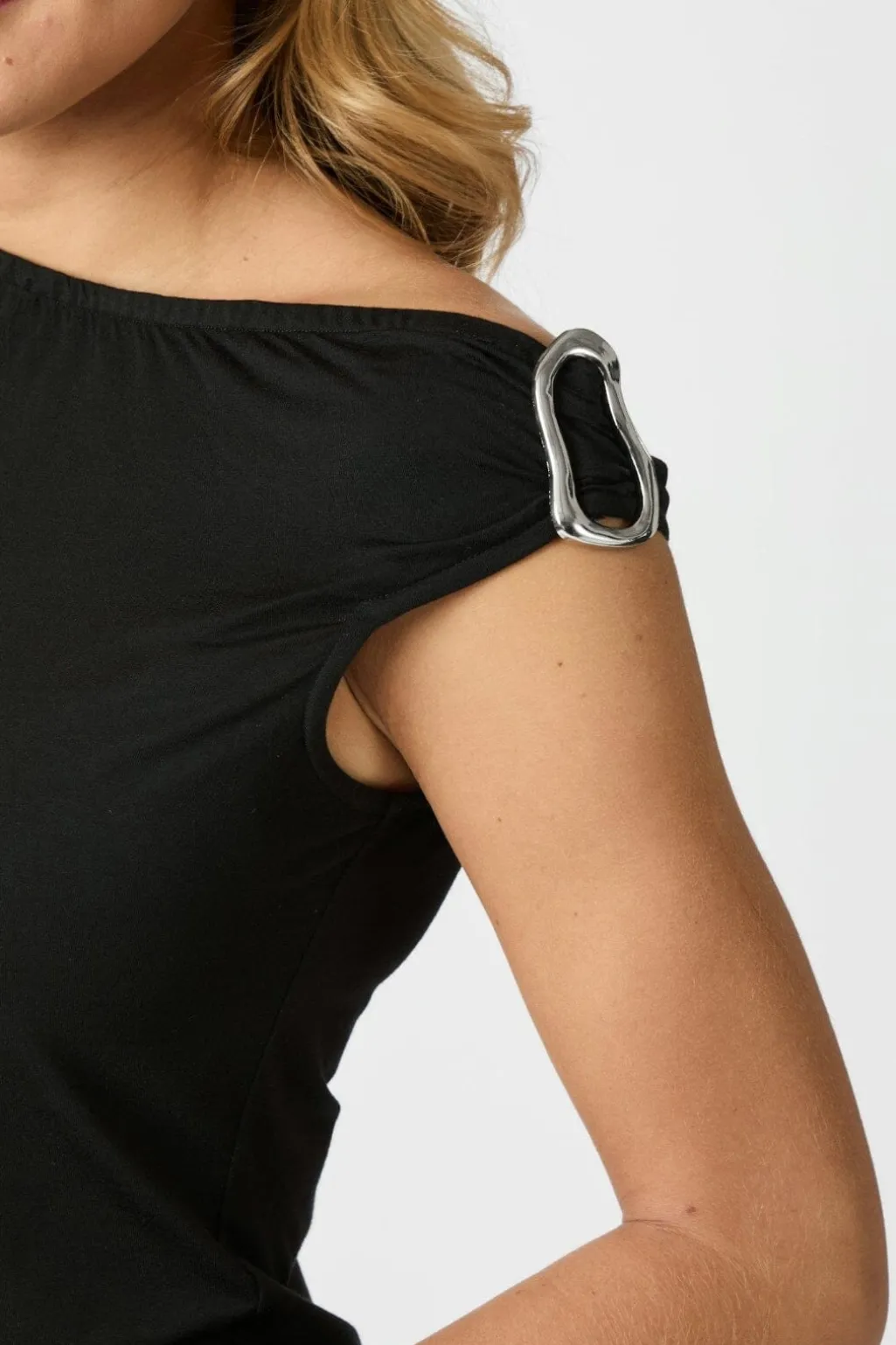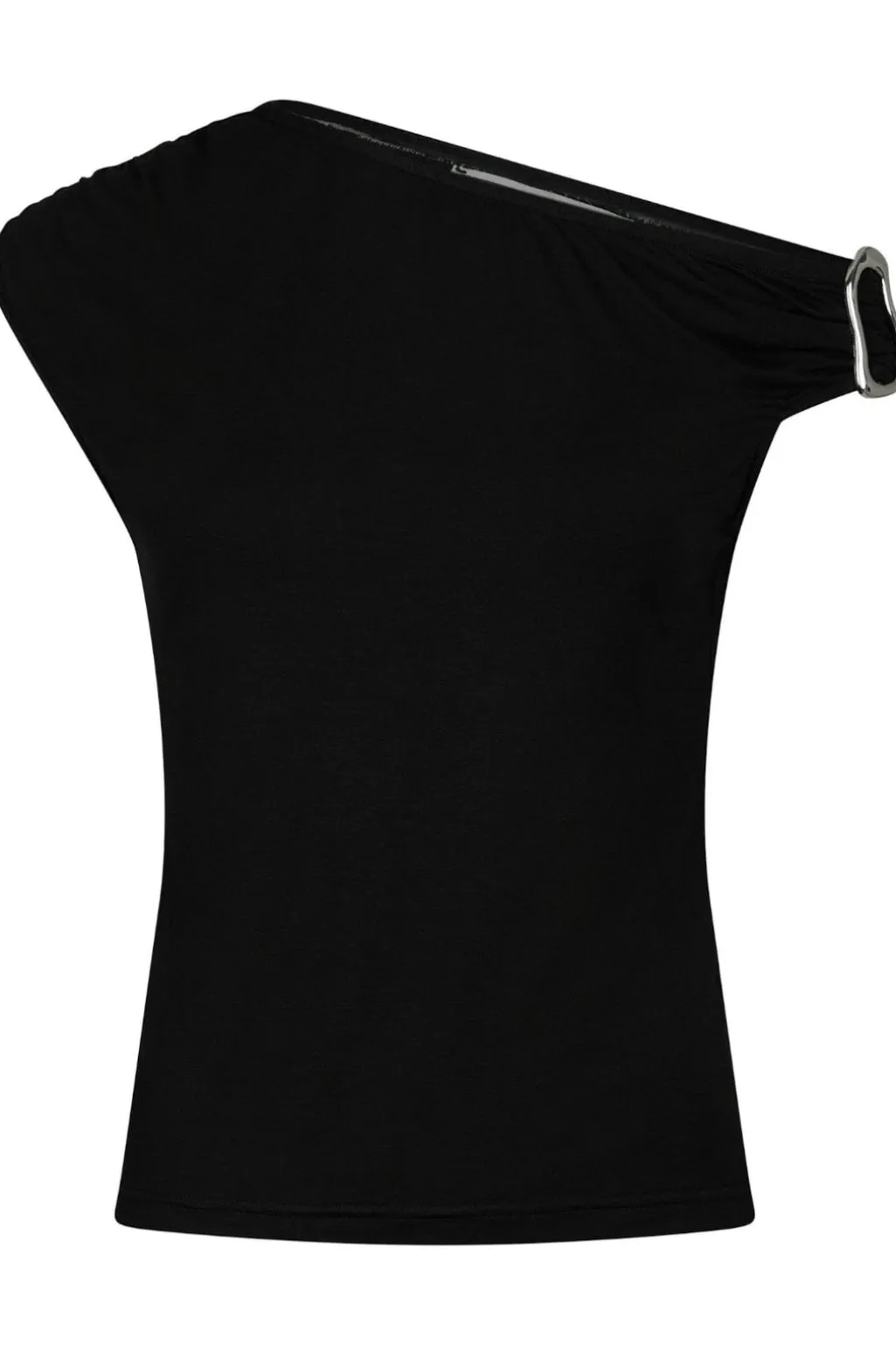 Sort jersey-top med off-shoulder-design fra Neo Noir. Toppen har en spænde-detalje og en enkel stil, der gør den nem at style til forskellige anledninger.