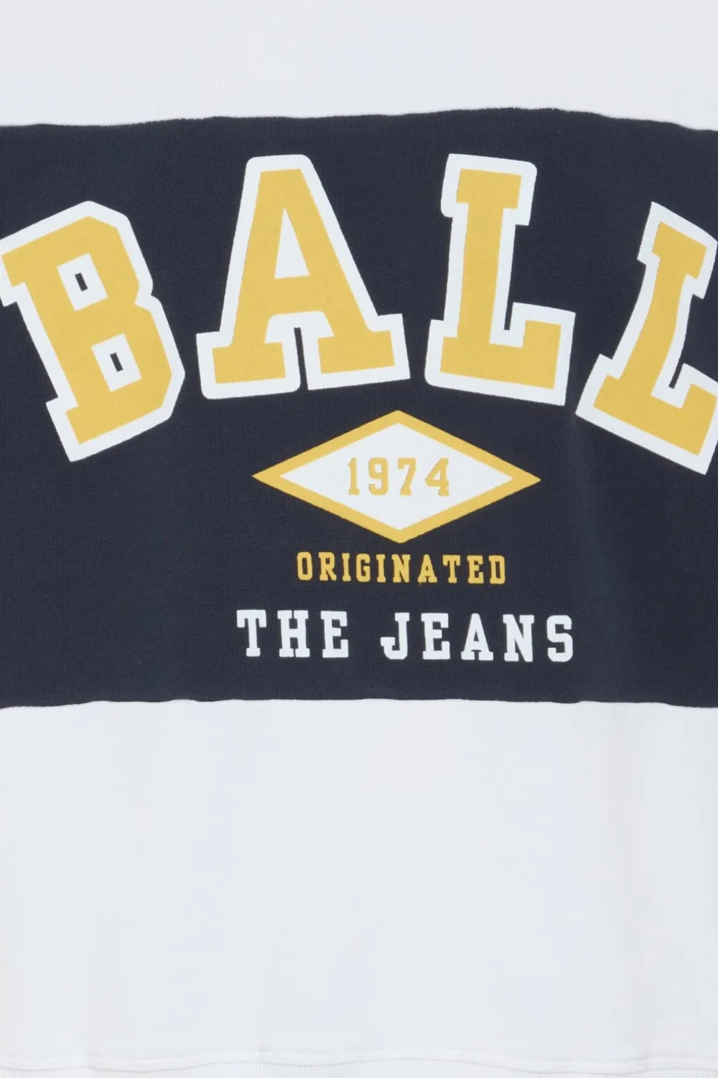 Sweatshirt fra Ball med farveblokdesign i hvid, mørkeblå og gul. Den har teksten BALL 1974 ORIGINATED THE JEANS på forsiden.