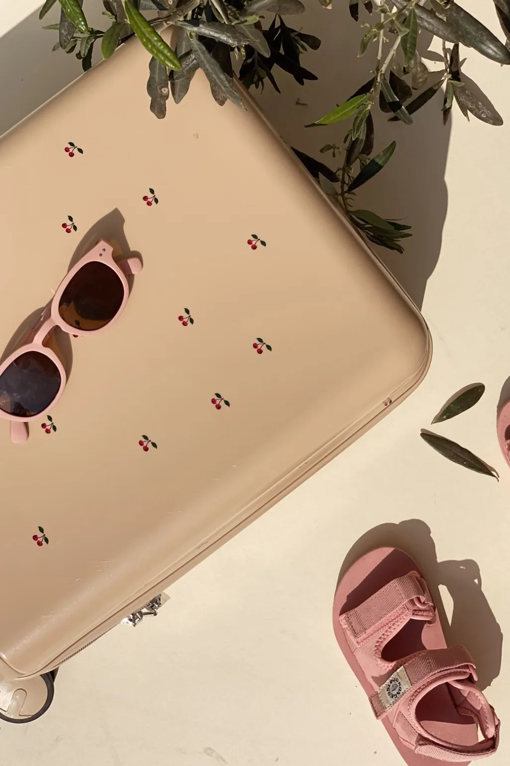 En rejsekuffert med fire hjul og TSA-lås. Den hårde yderskal har et mønster med små kirsebær på en lys baggrund og flere indvendige rum til organisering af rejseeffekter.