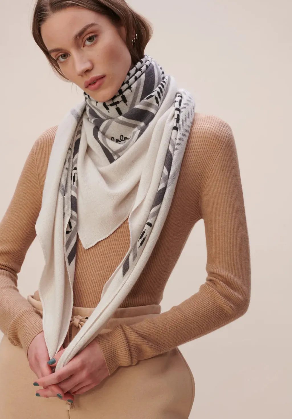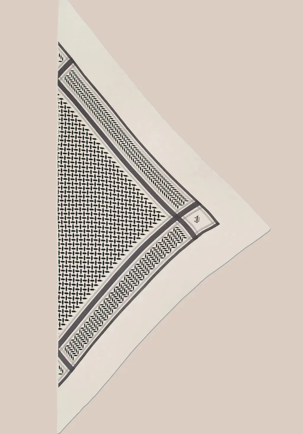 Trekantet tørklæde fra Lala Berlin i cremehvid uld med sort Kufiya-mønster. Det geometriske print følger tørklædets kanter og skaber et grafisk udtryk.
