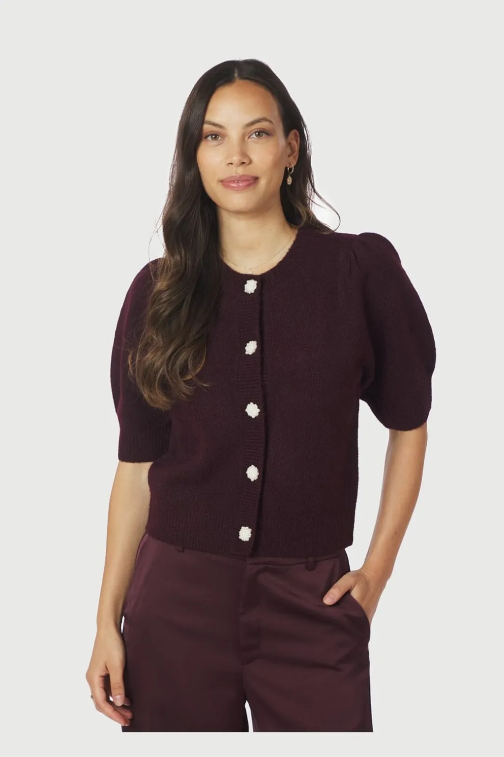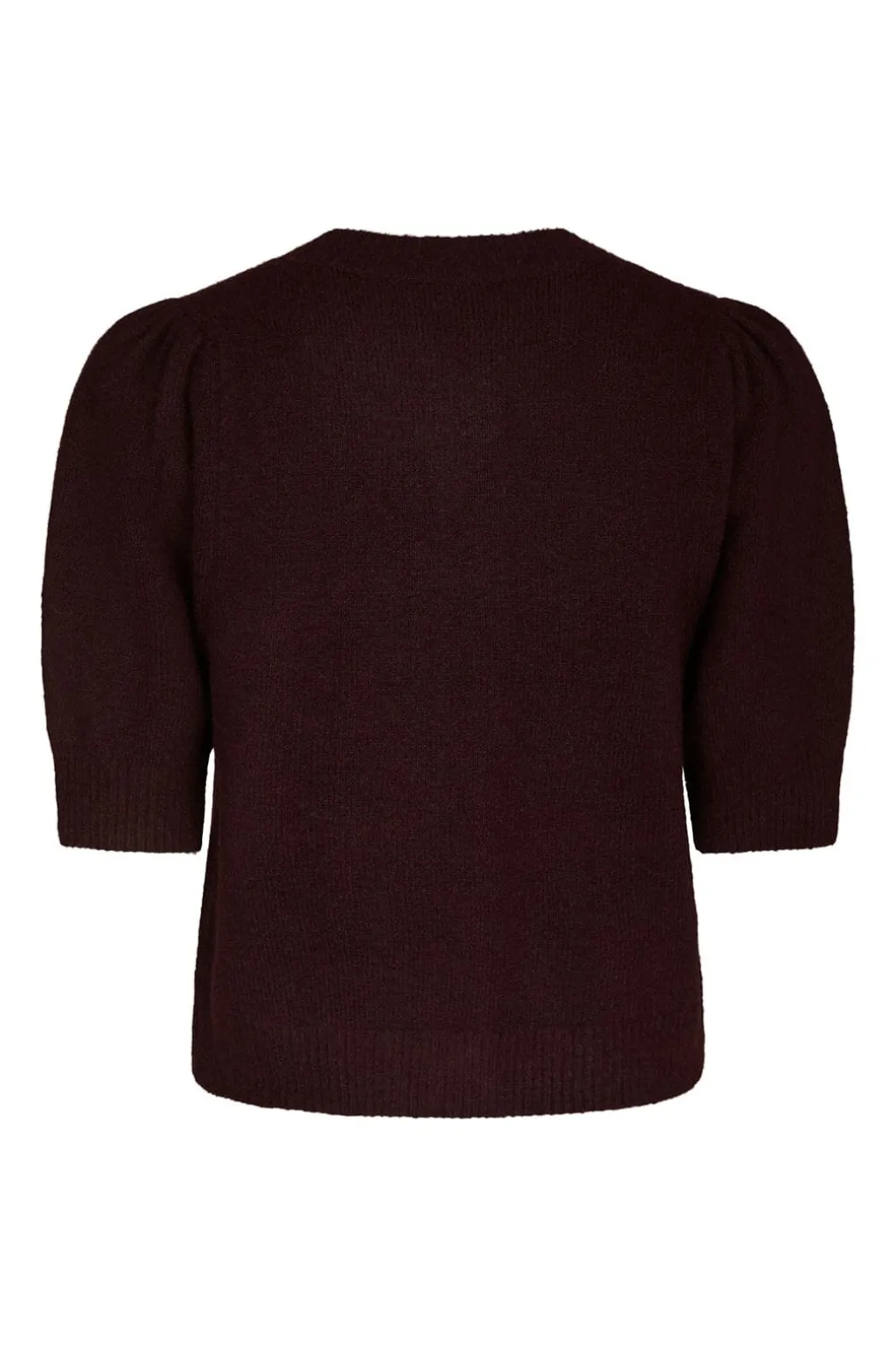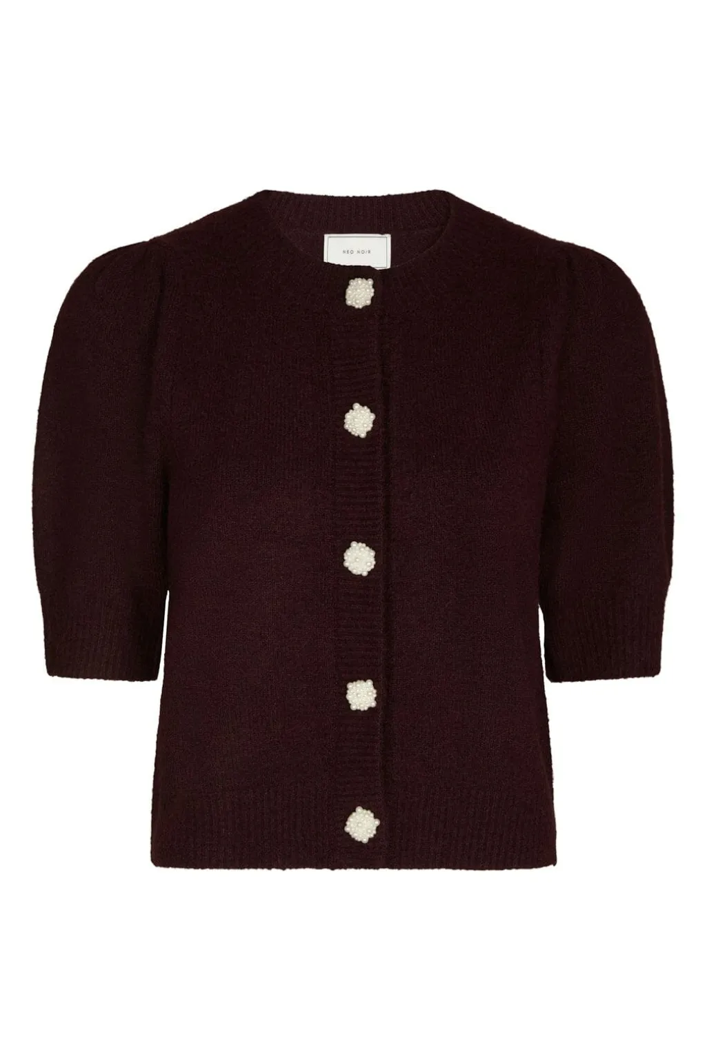 Vinrød cardigan fra Neo Noir med korte pufærmer. Cardiganen har rund halsudskæring og perleknapper foran, der giver et fint præg på den ensfarvede strik.