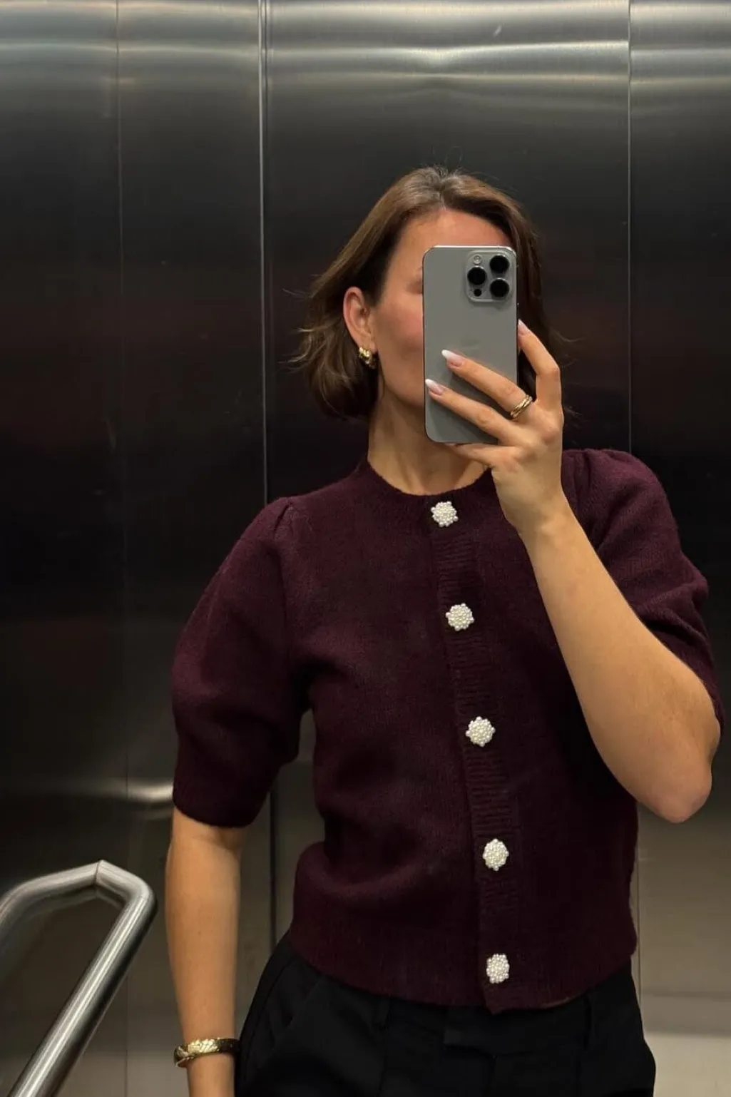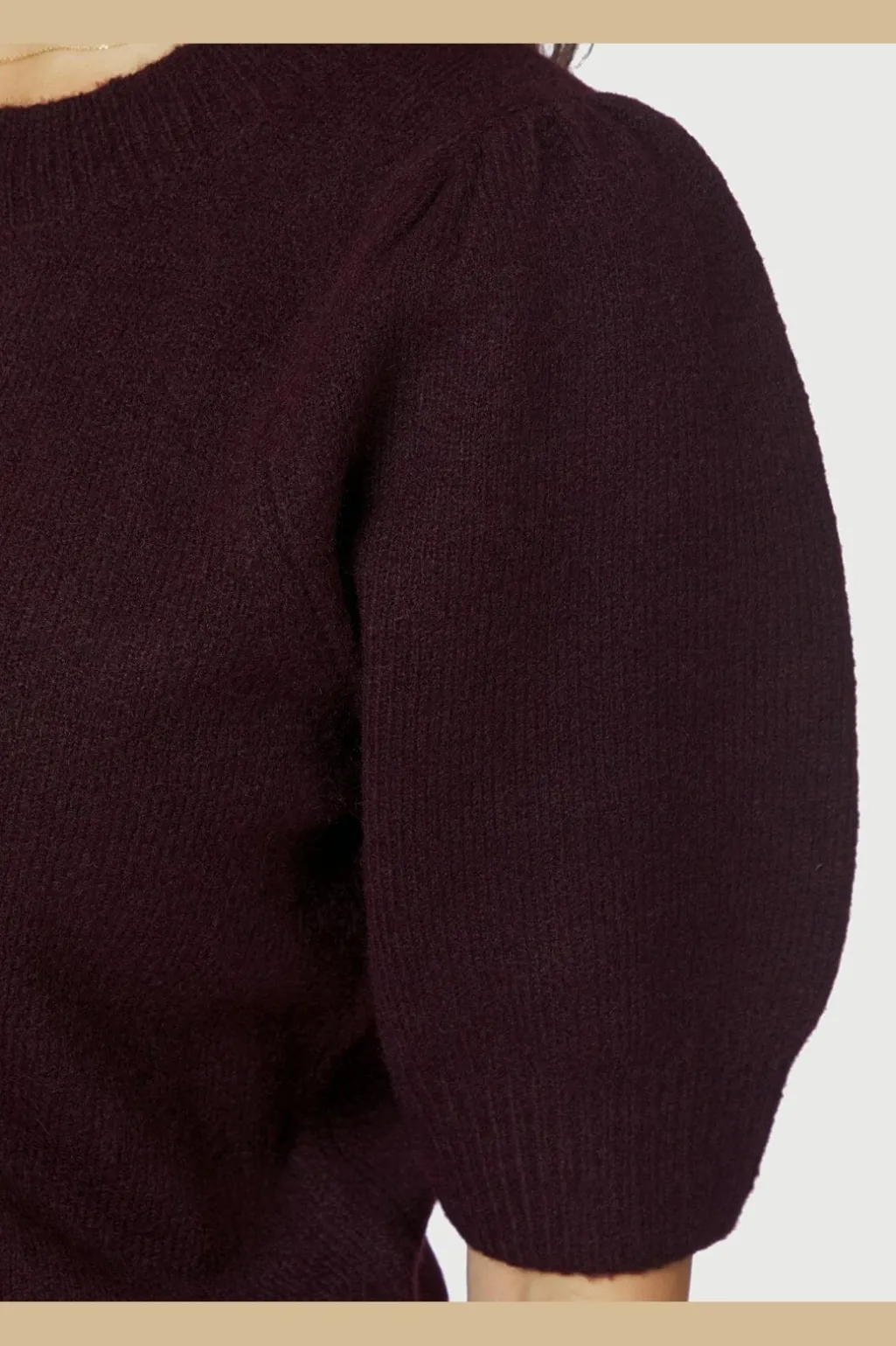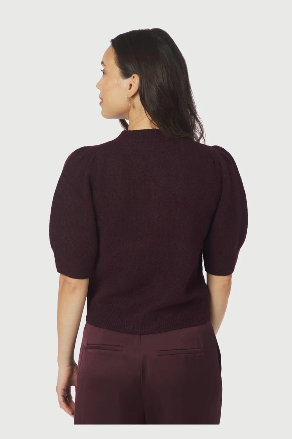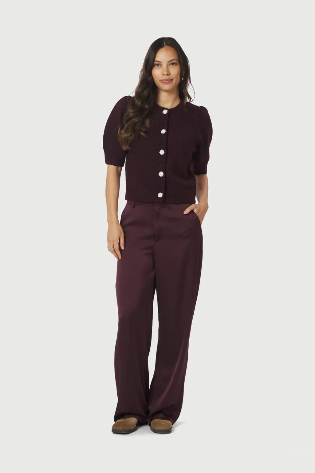 Vinrød cardigan fra Neo Noir med korte pufærmer. Cardiganen har rund halsudskæring og perleknapper foran, der giver et fint præg på den ensfarvede strik.
