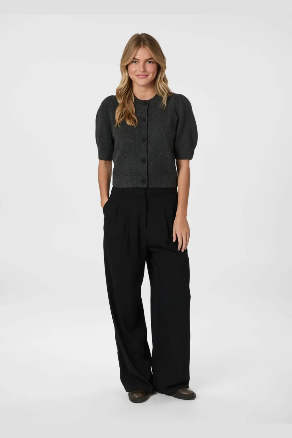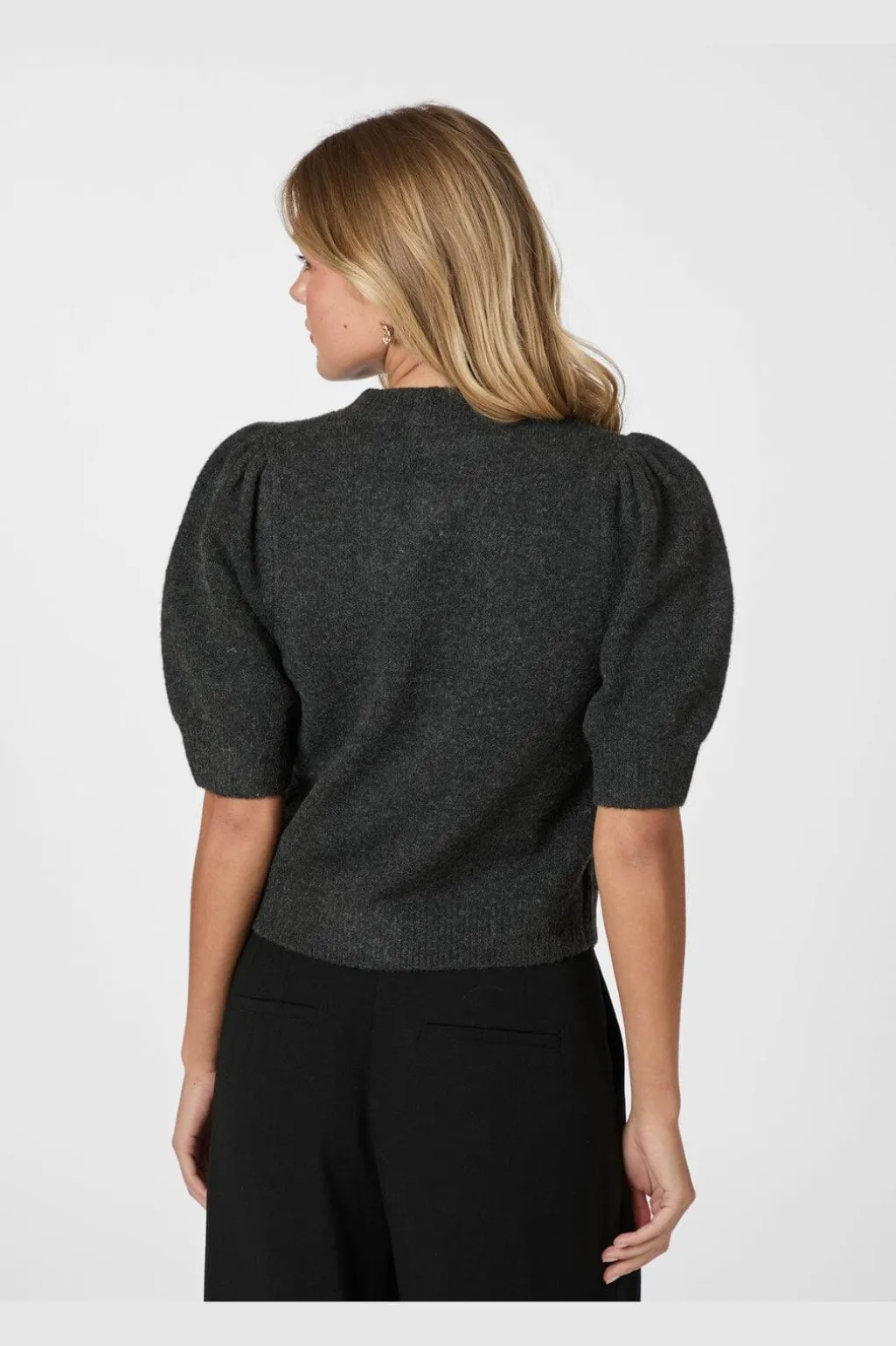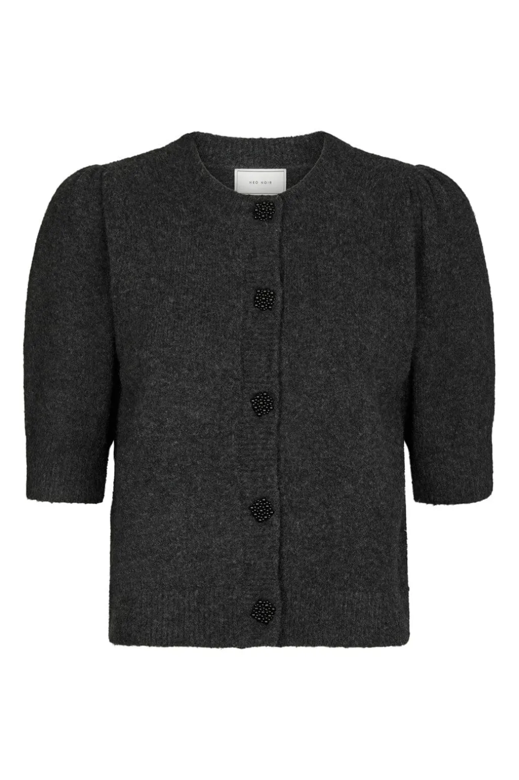Strikket cardigan fra Neo Noir i antracit melange. Den har korte pufærmer og rund hals med en række små pailletknapper foran, der giver et diskret pift.