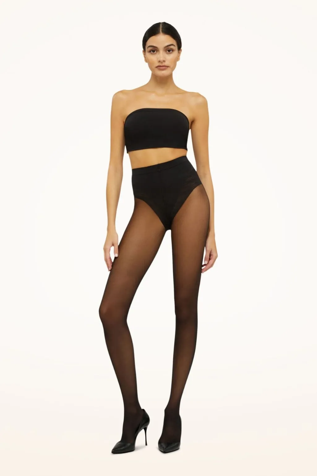 Sorte strømpebukser med formende effekt til maven. De har en mat, gennemsigtig finish på 20 denier og et blondeundertøjsområde med blødt taljebånd.