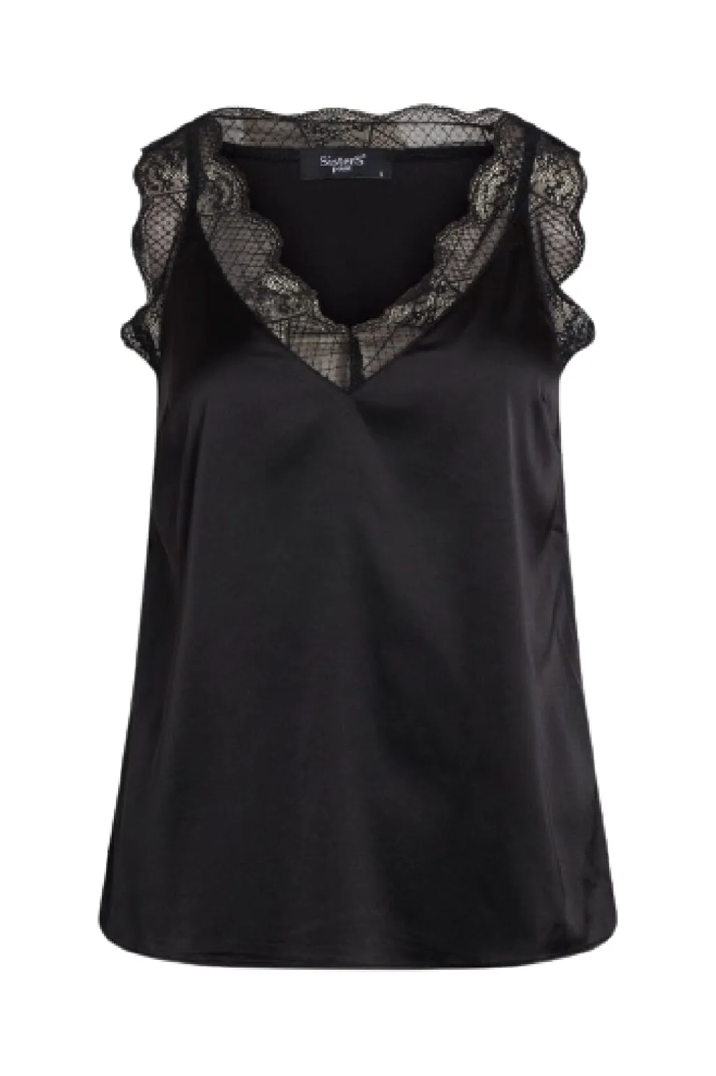 Sort top fra Sisters Point i satinmateriale med blondedetaljer ved V-udskæringen. Toppen har en blød overflade og kan styles alene eller med en t-shirt under.