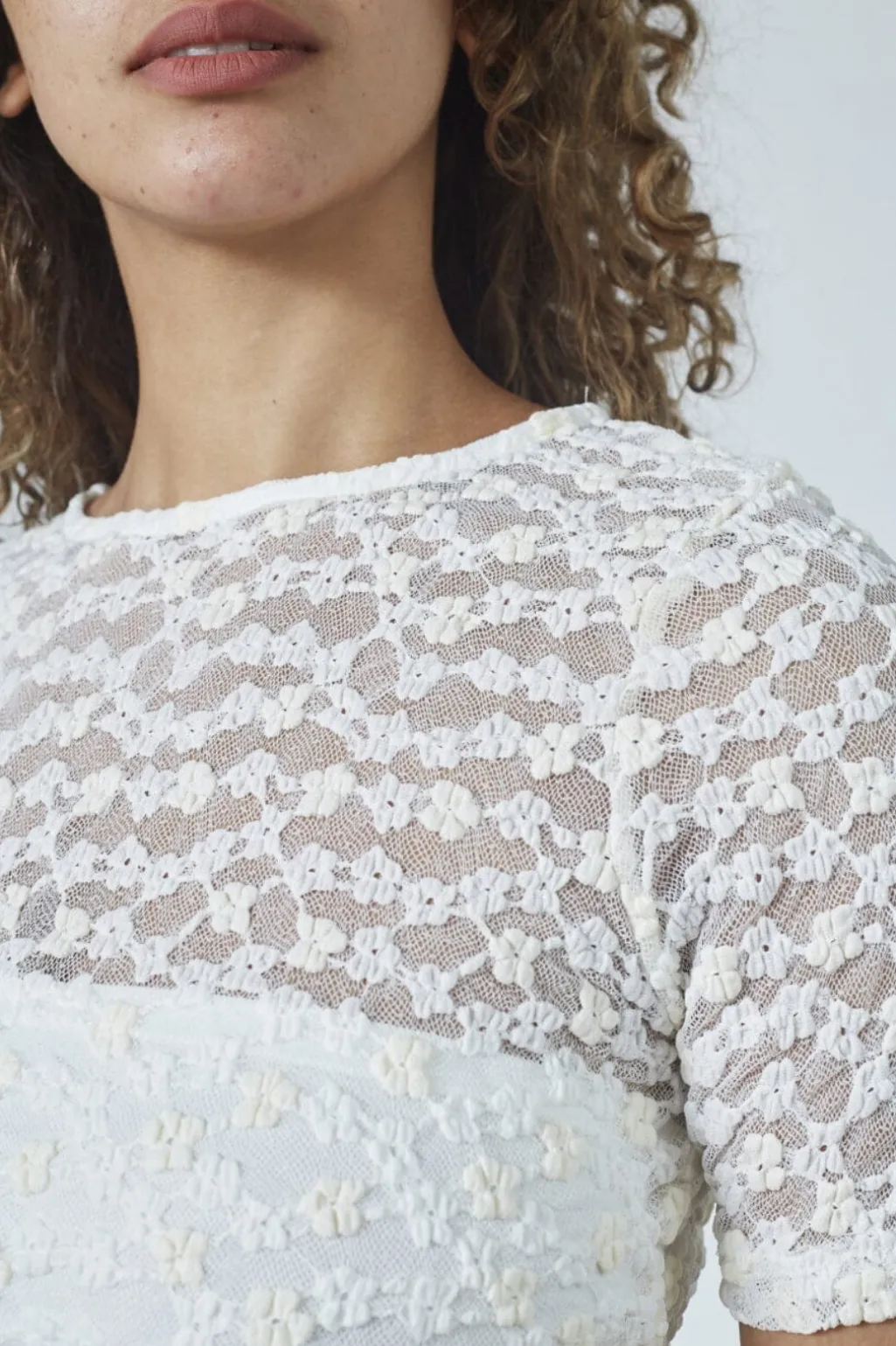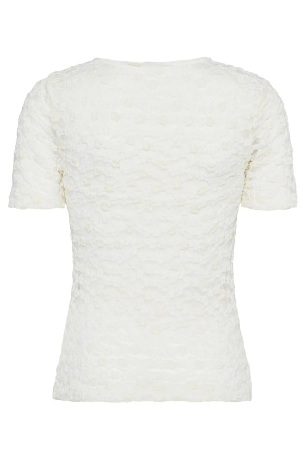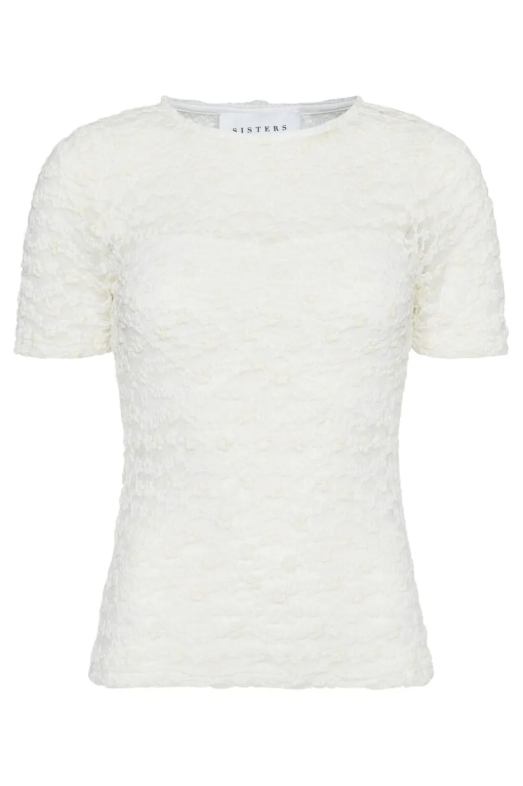 Cremefarvet blondetop fra Sisters Point med kort ærme og rund hals. Toppen har en tætsiddende pasform og er lavet af transparent blonde med indvendigt foer.