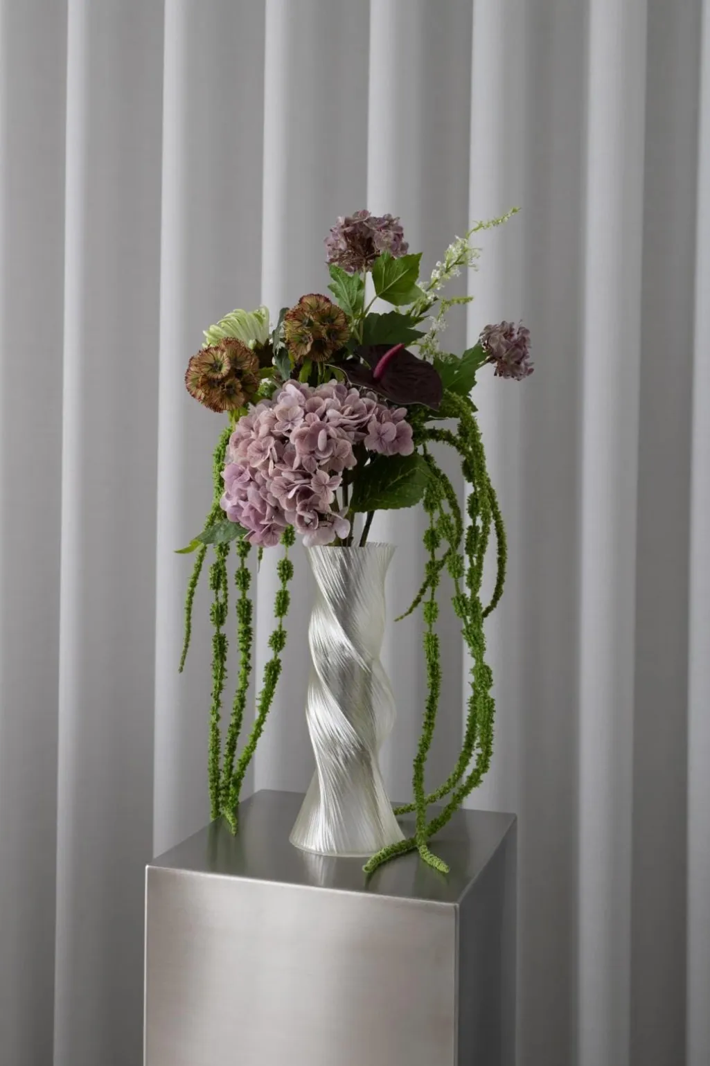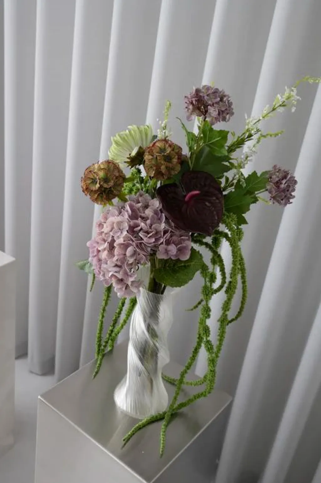 Præsenterer vores Velvet Glow Bouquet – en livlig blomsteropsats omhyggeligt fremstillet med latex for et autentisk og naturtro udseende. Buketten indeholder en fantastisk samling af grønne og blomstrende blomster.Denne buket indeholder:- **Amaranthus 6 Fork (2x):** Den grønne amaranthus stråler med sine unikke, hængende blomsterklaser og friske grønne nuancer, hvilket tilføjer en moderne og livlig elegance.- **Anthurium Bordeaux:** Den bordeaux anthurium fanger øjet med sit glansfulde, hjerteformede blad og dybe bordeaux nuancer, hvilket tilføjer et luksuriøst og sofistikeret touch.- **Plante – Hvid:** Den grønne plante stråler med sine friske grønne blade og elegante hvide blomster, hvilket tilføjer et rent og harmonisk touch.- **Snebold Hortensia – Lilla:** Den lilla snebold hortensia stråler med sine frodige blomster og rige lilla nuancer, hvilket tilføjer en sofistikeret og livlig elegance.- **Scabiosa Blomst – Støvet (2x):** Den støvede scabiosa, med sin sfæriske blomst og friske nuancer, tilføjer en moderne og naturlig