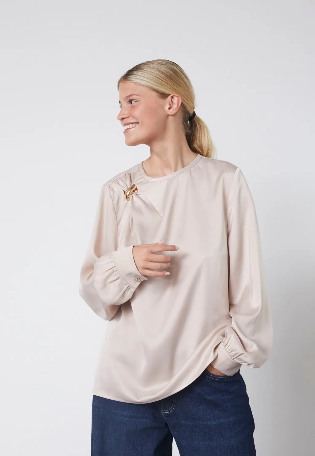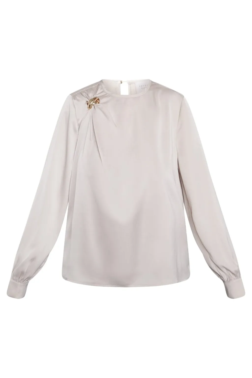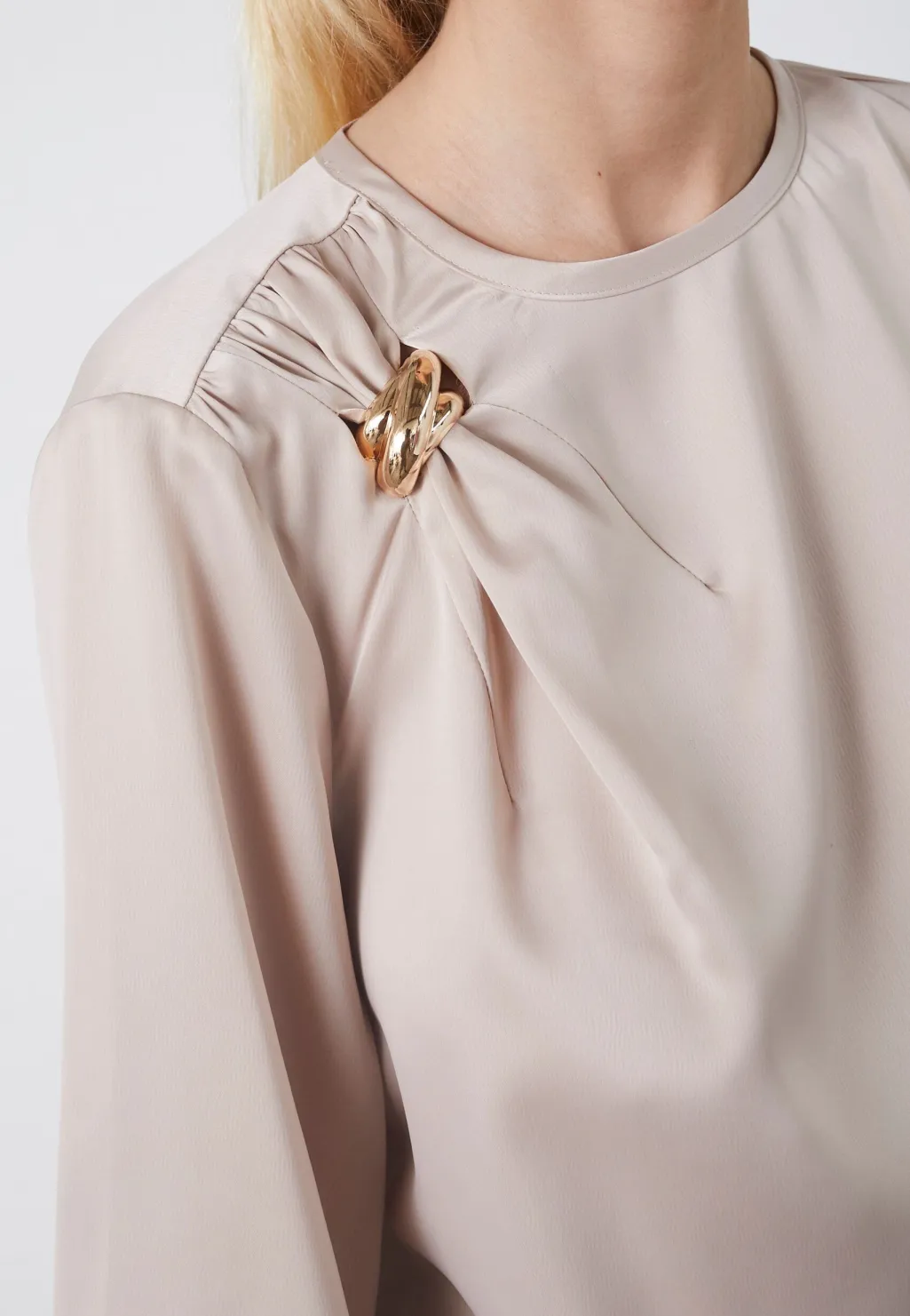 En lys cremefarvet bluse fra Sisters Point med lange ærmer og et guldfarvet metalspænde på skulderen.