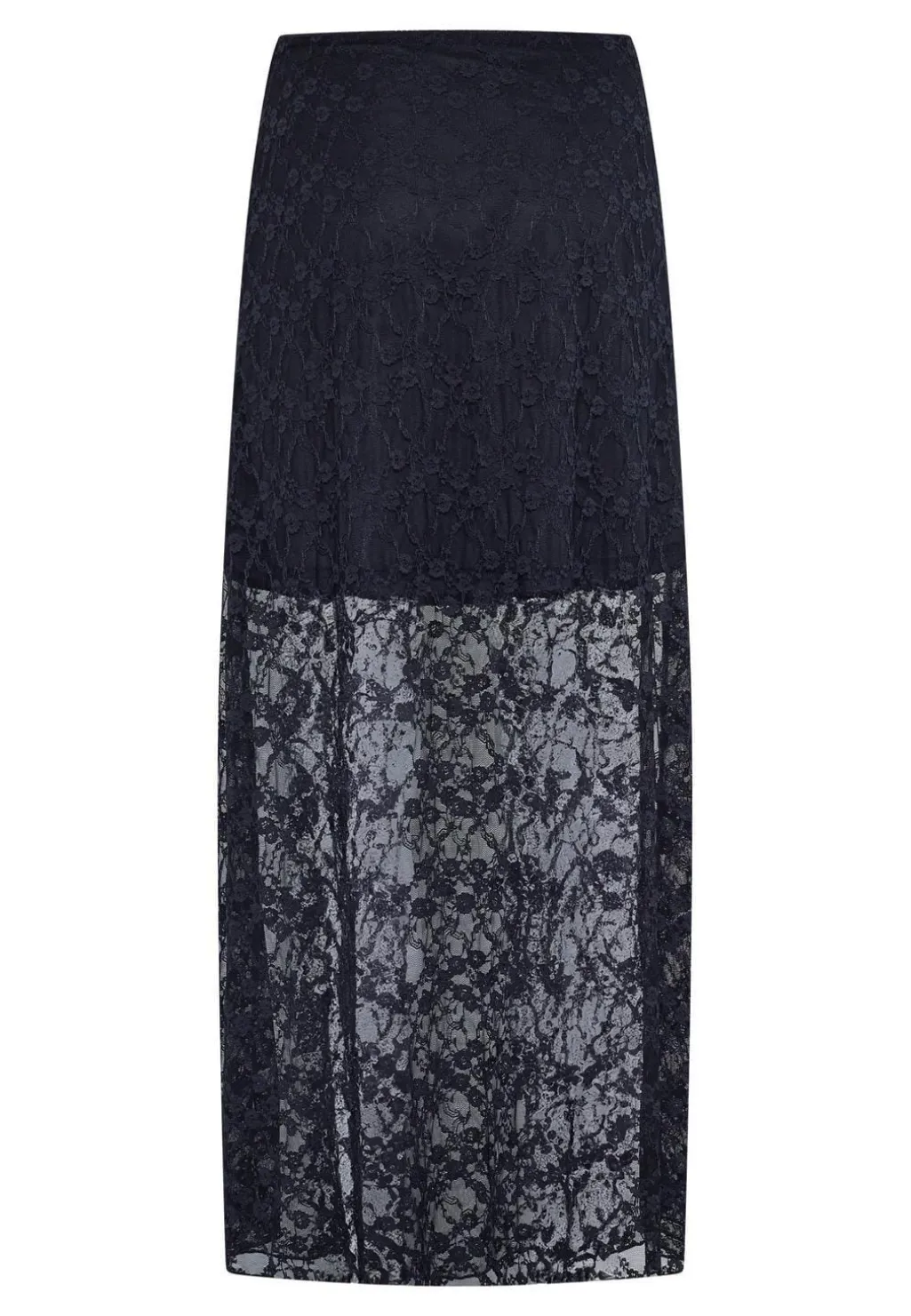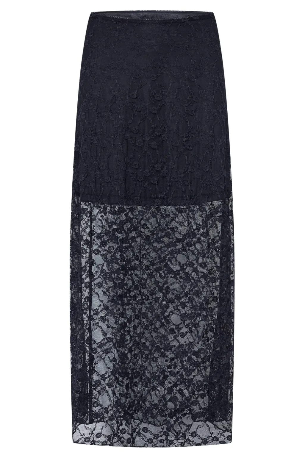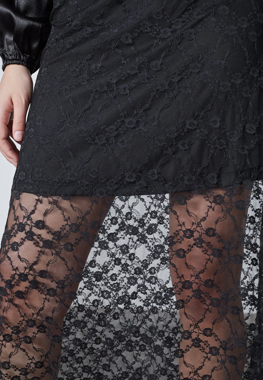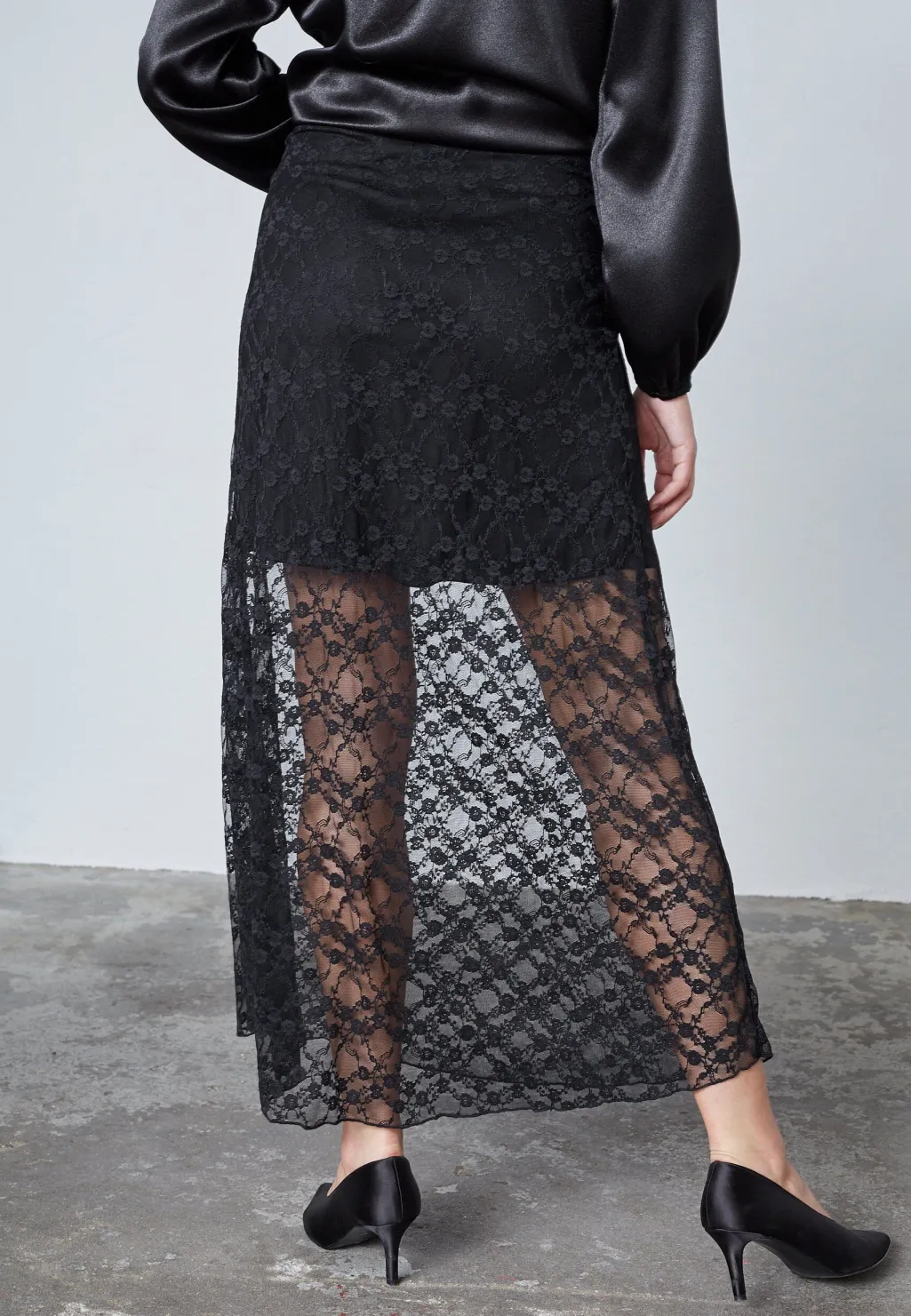 Sort nederdel fra Sisters Point med blomstret blondemønster. Den øverste del er tætsiddende og uigennemsigtig, mens den nederste del har et gennemsigtigt blondelag fra knæet og ned.