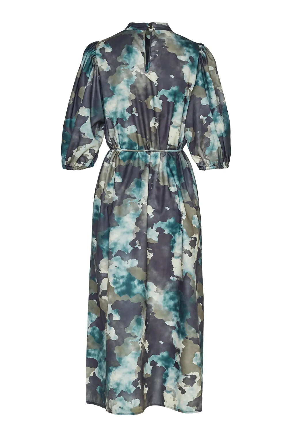 Kjole fra Sisters Point med camouflagemønster i blå, grå og beige nuancer. Kjolen har høj hals med pufærmer og bindebånd i taljen.