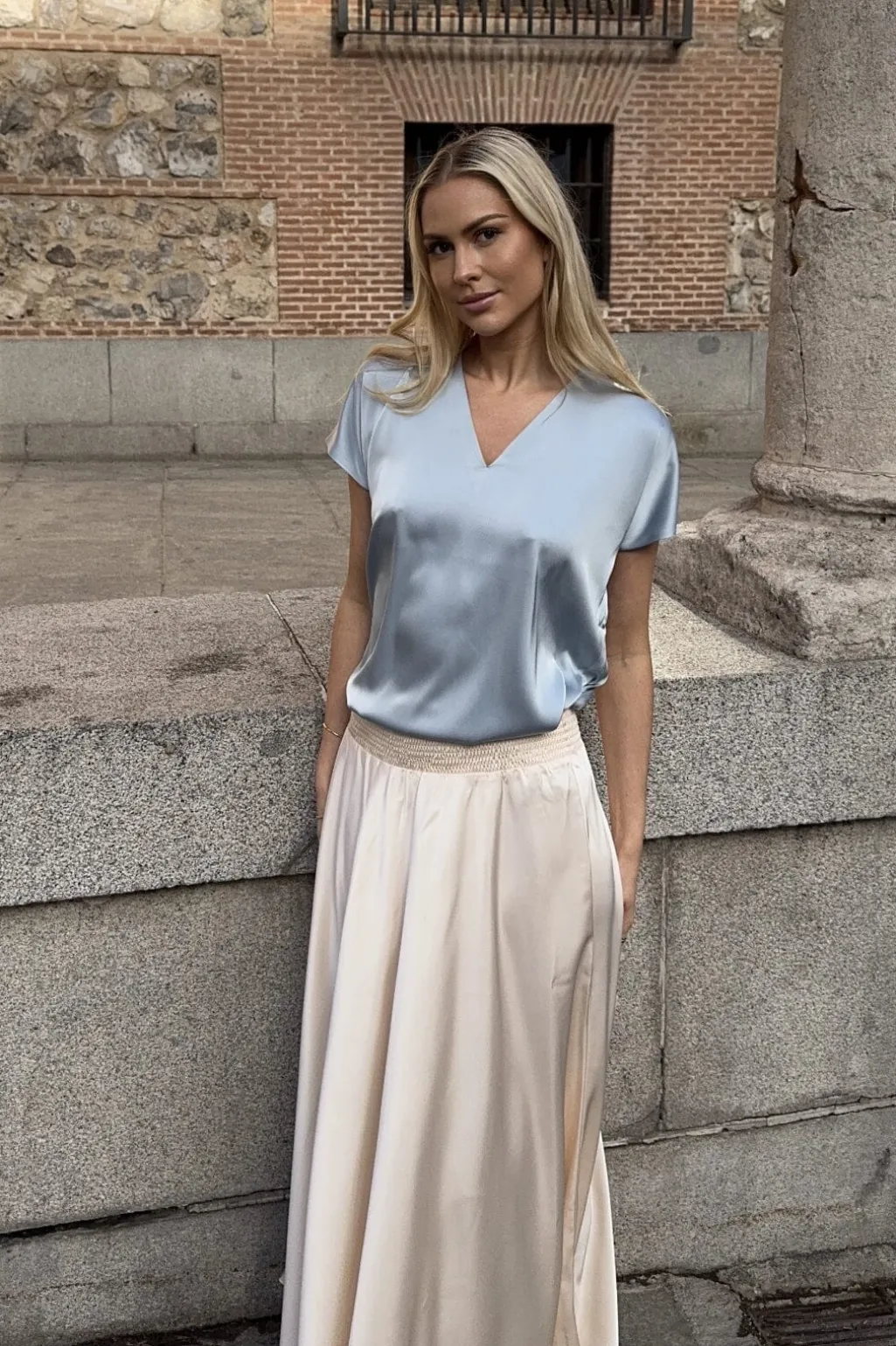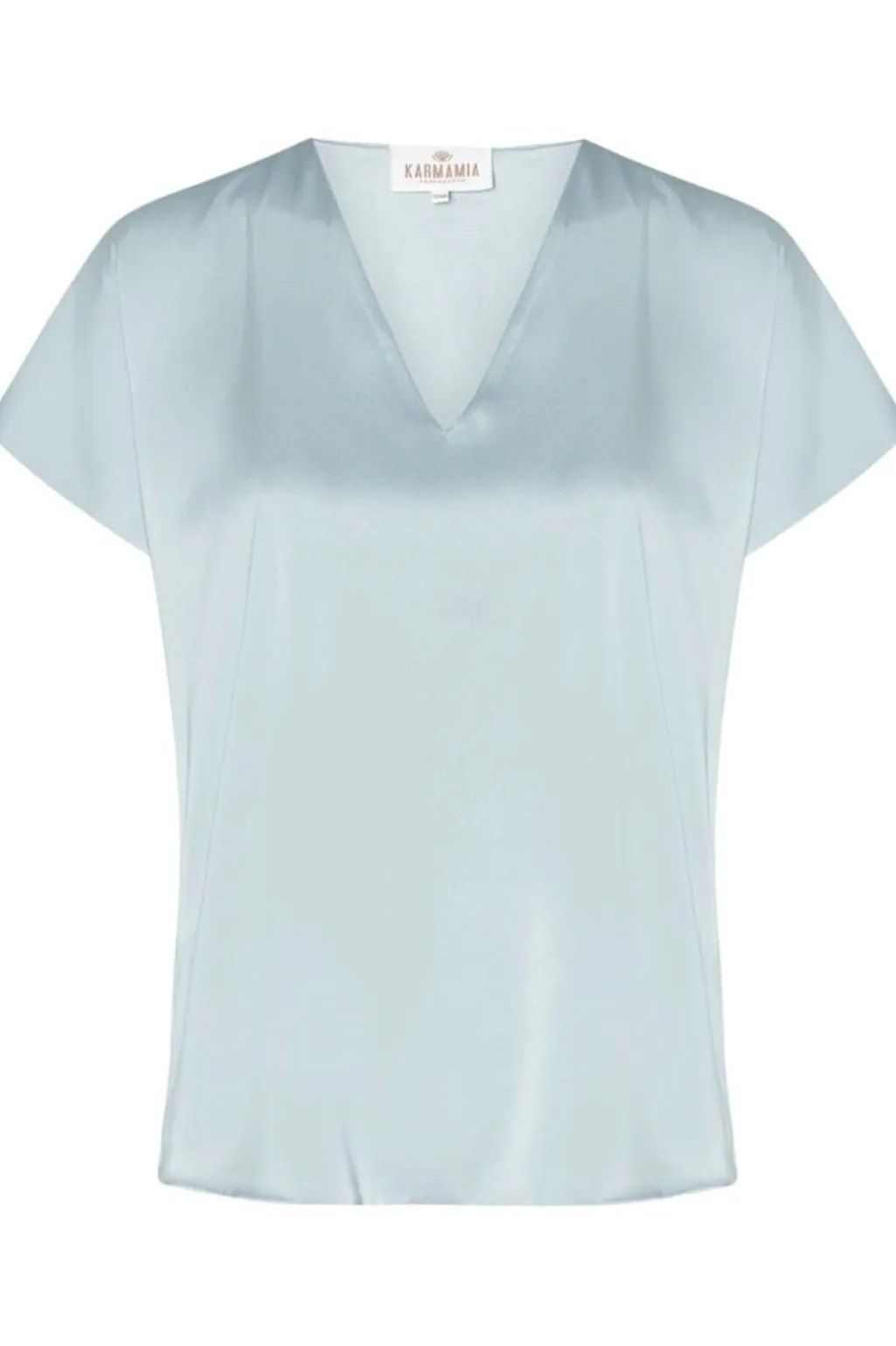 Lyseblå bluse fra Karmamia med v-hals og korte ærmer. Den silkeagtige overflade giver blusen et blødt fald, og den kan bruges til både hverdag og fest.
