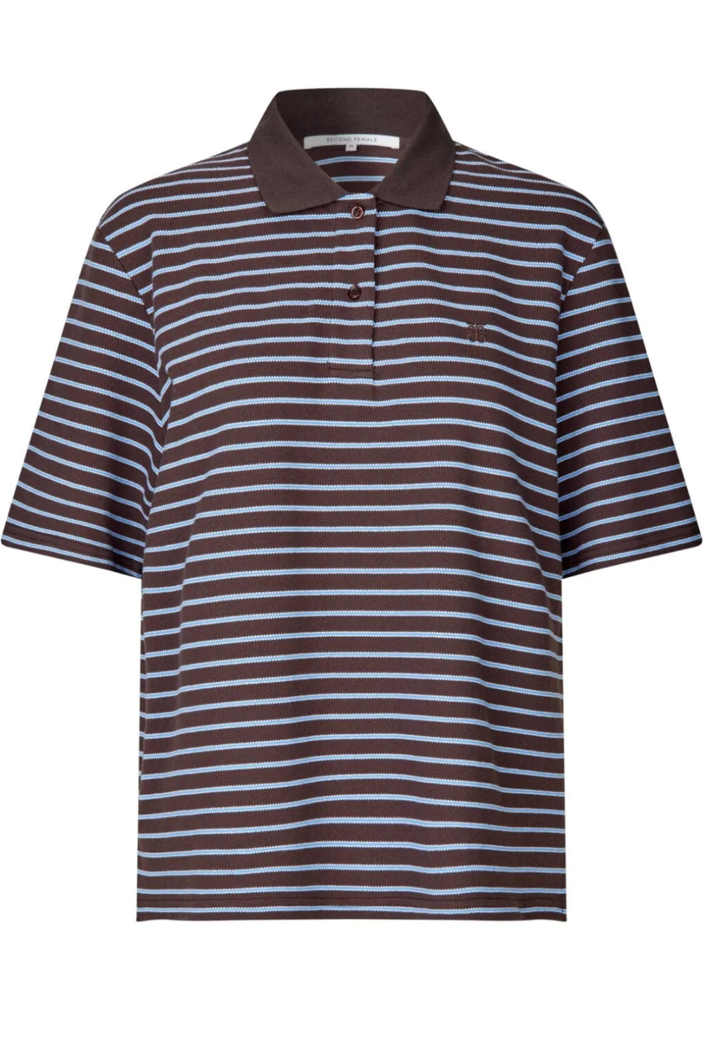 Poloshirt fra Second Female med striber i chokoladebrun og lyseblå. Den har en klassisk polokrave med knapper og korte ærmer i regular fit.