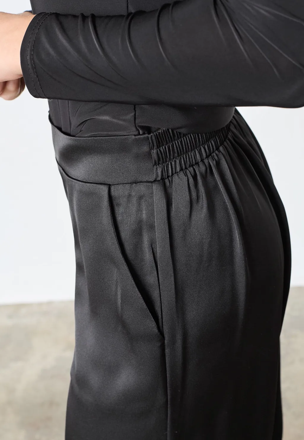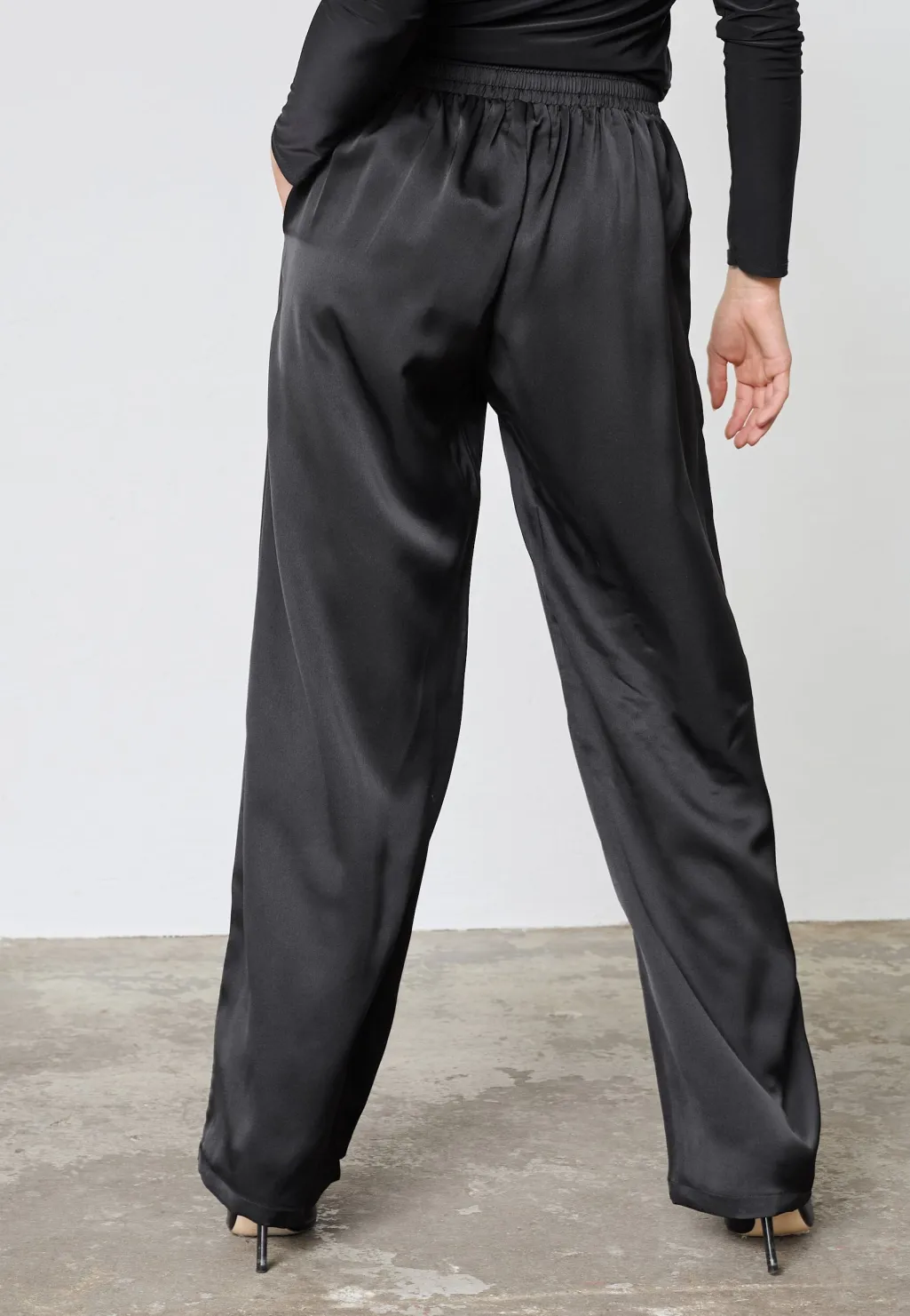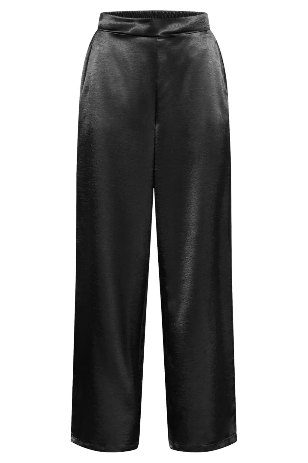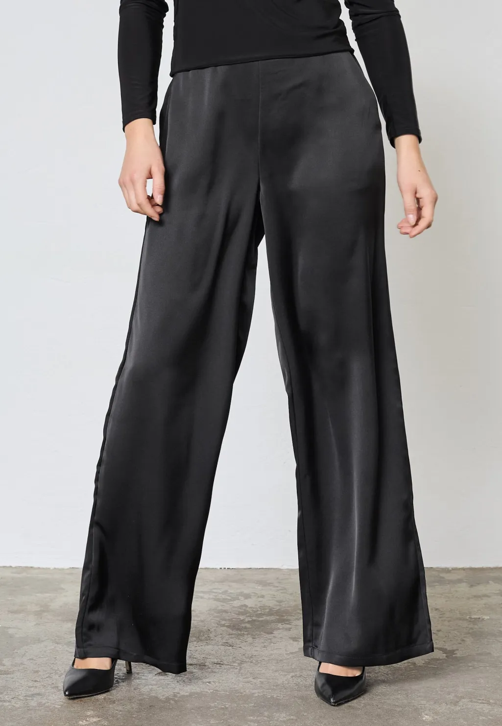 Sorte bukser fra Sisters Point i satinlignende stof. Bukserne har en gulvlang længde og er velegnede til både festlige og formelle lejligheder.