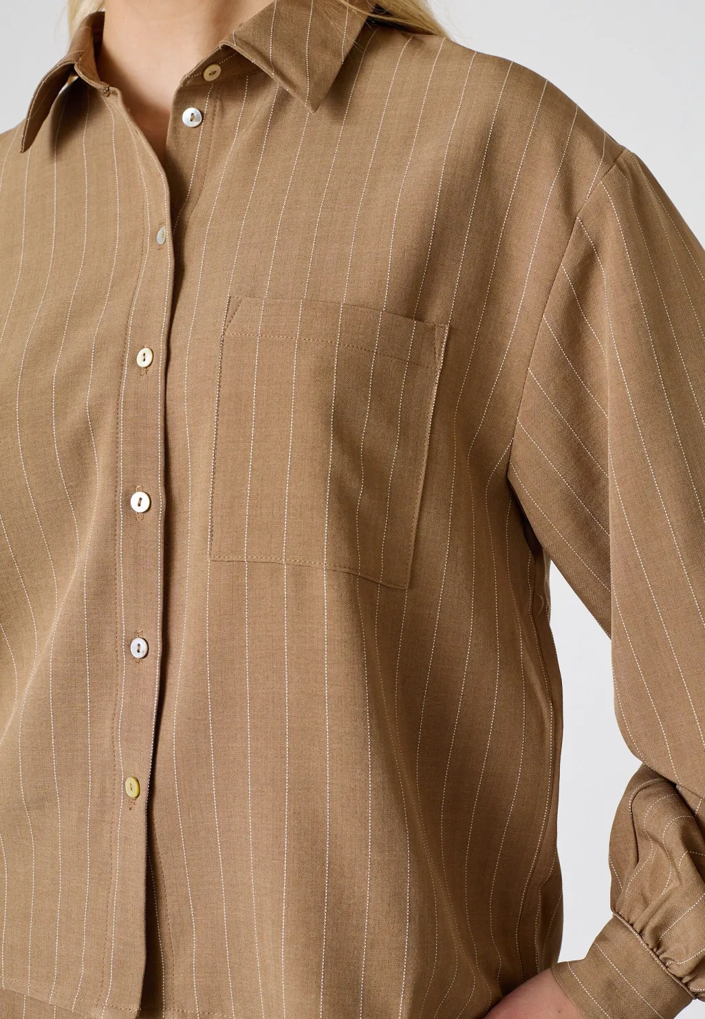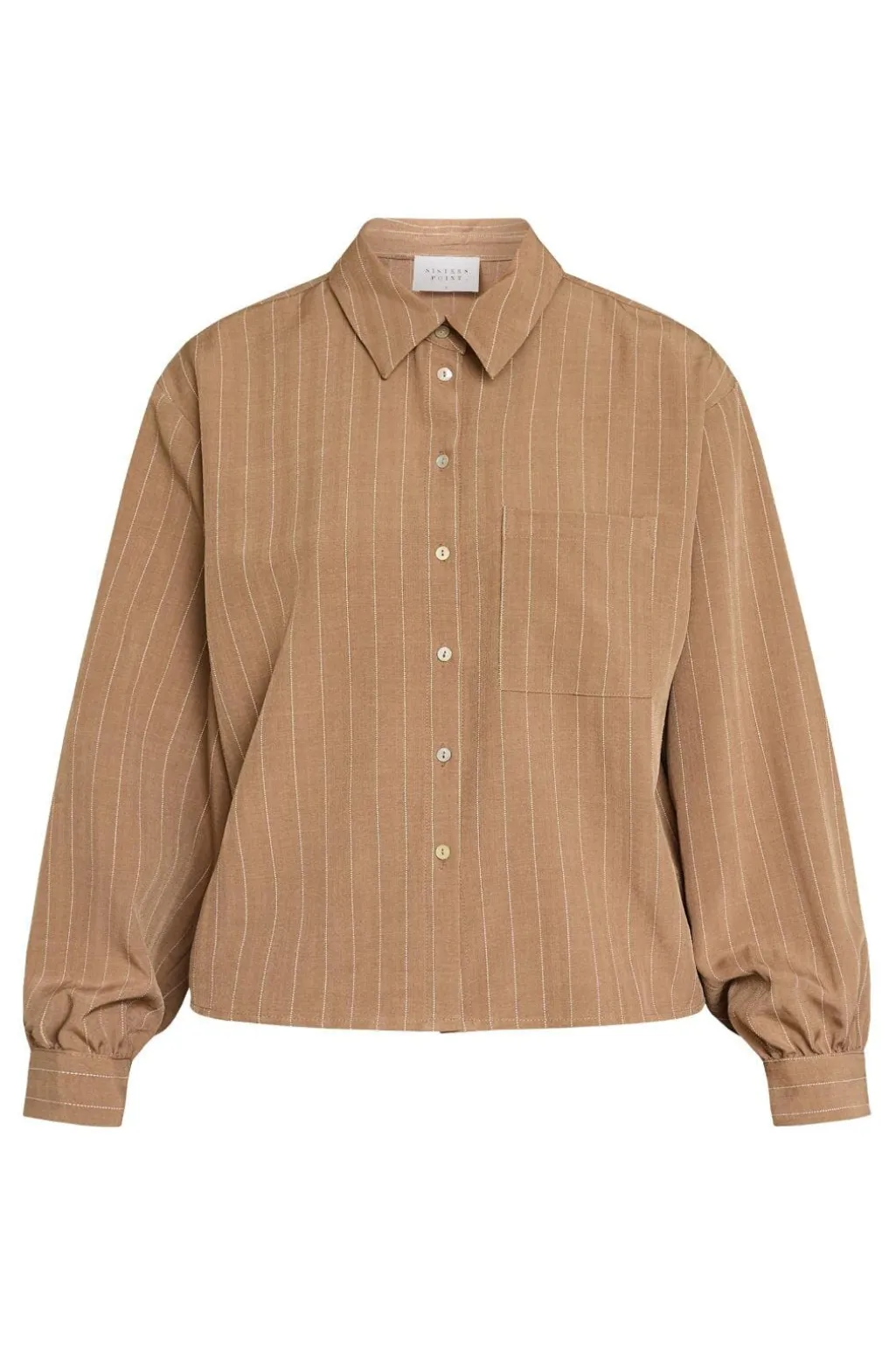 Skjorte fra Sisters Point i hasselnøddebrun med pinstriber. Den har en klassisk skjortekrave og knaplukning foran, samt en brystlomme på venstre side.