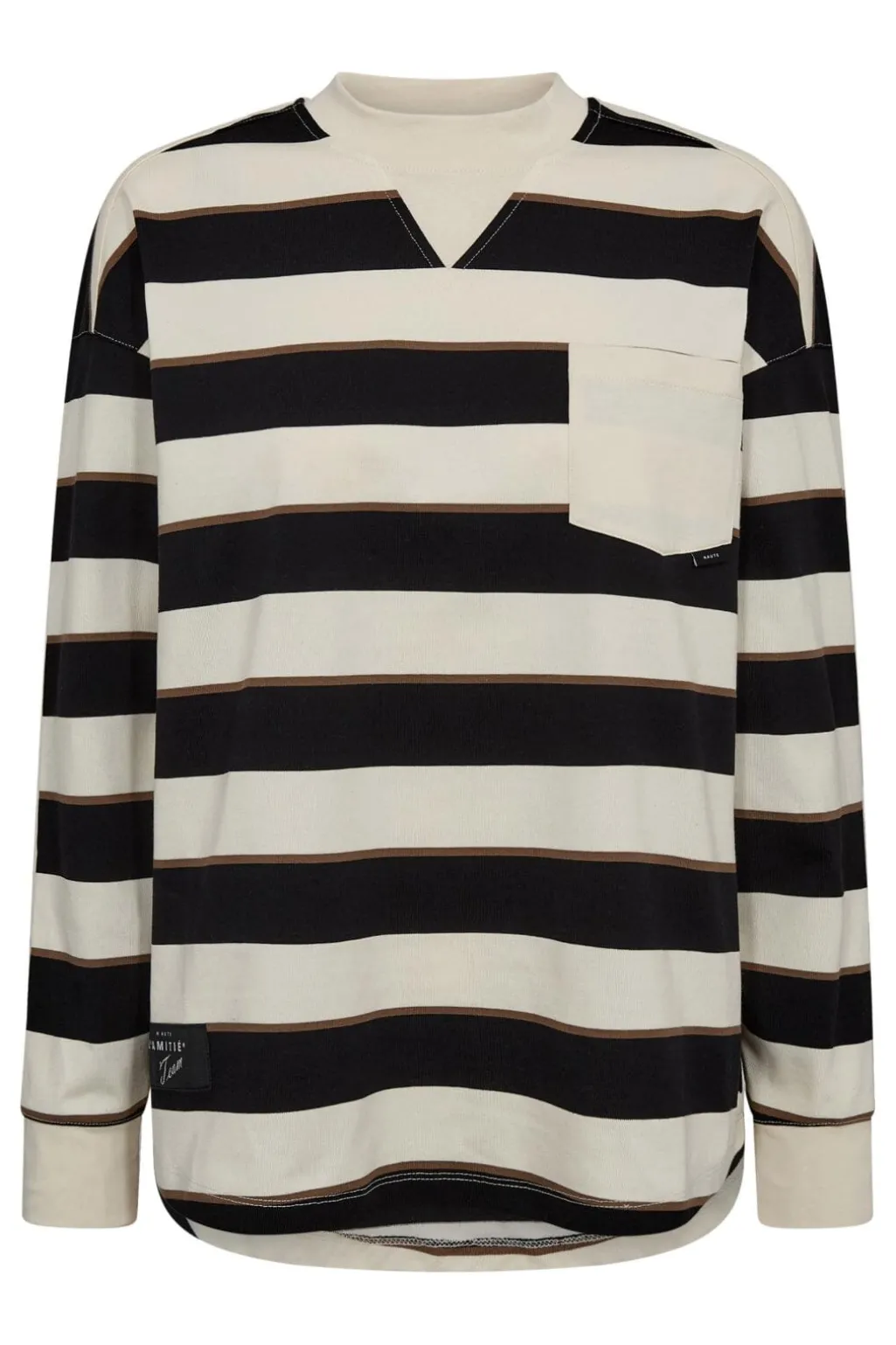 Langærmet T-shirt fra Haute L’Amitié med vandrette sorte og offwhite striber. Den har en oversized pasform og dekorative syninger.