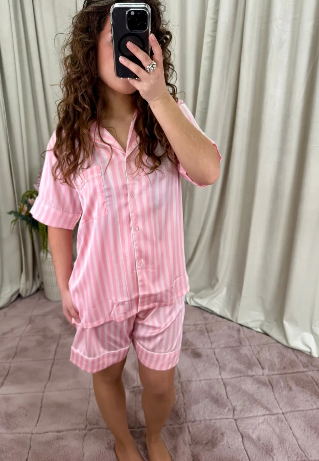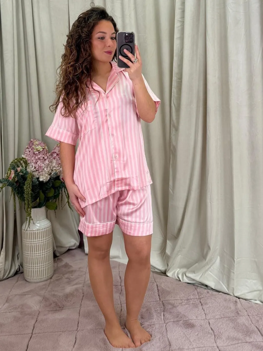 Stribet pyjamassæt fra A-bee med kort ærme og lårkorte shorts. Den lyserøde og hvide stribede pyjamas har praktiske lommer og knapper foran.