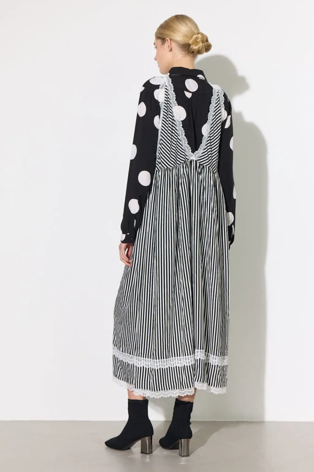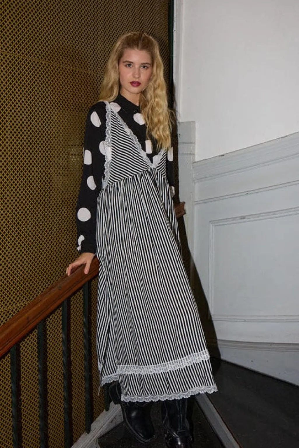 Hunkøn Vicky Dress er en afslappet A-formet kjole med en dyb udskæring både foran og bagpå. Den har fint trimmede kanter i blød blonde for et sofistikeret udtryk.Den ærmeløse design har dybe ærmegab, hvilket bidrager til dens ubesværede og luftige silhuet. Kjolen har diskrete rynker ved taljen for ekstra form, mens slidser i siderne sikrer bevægelsesfrihed og komfort.Vicky Dress er lavet af 100% viskose.