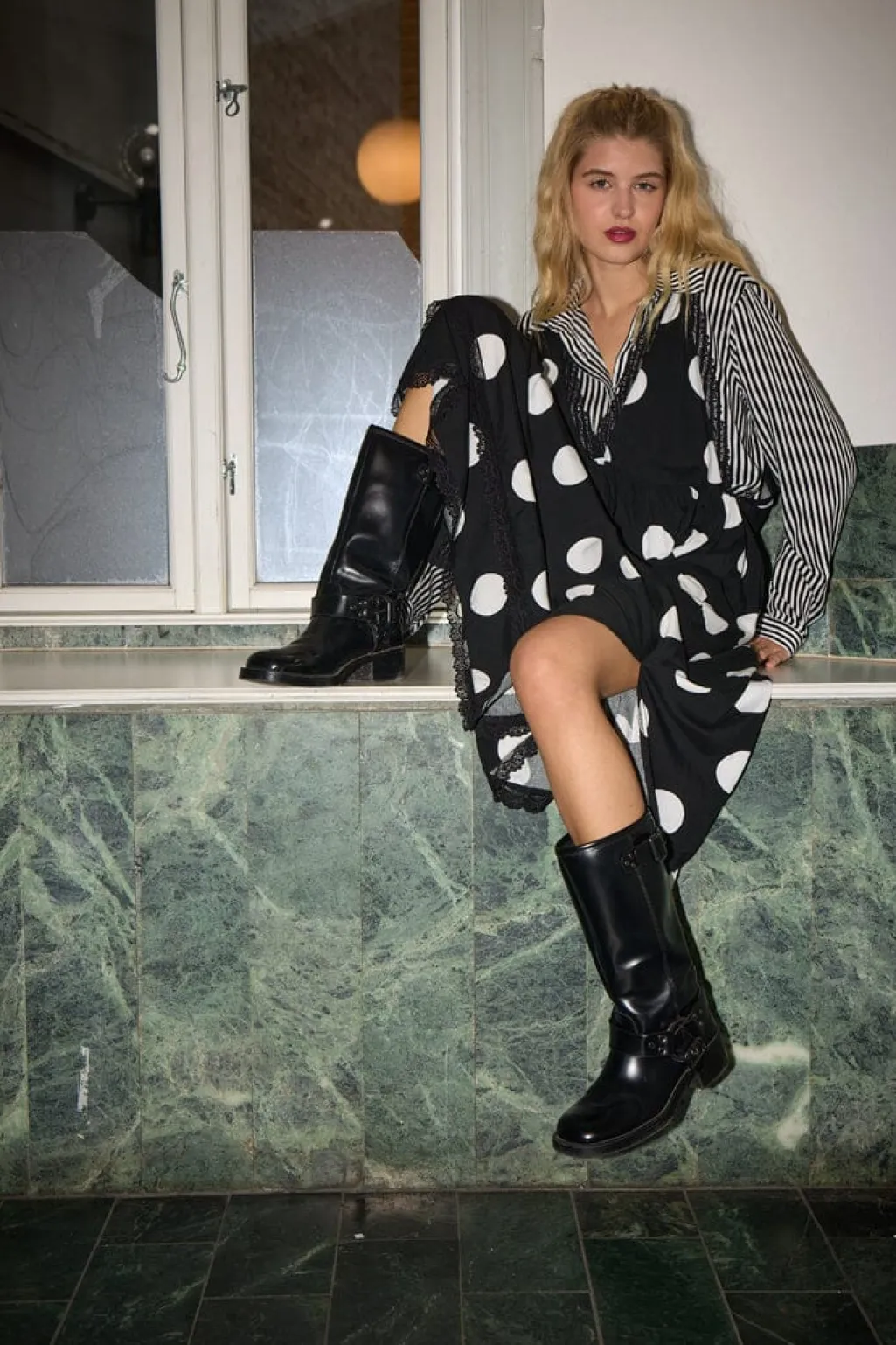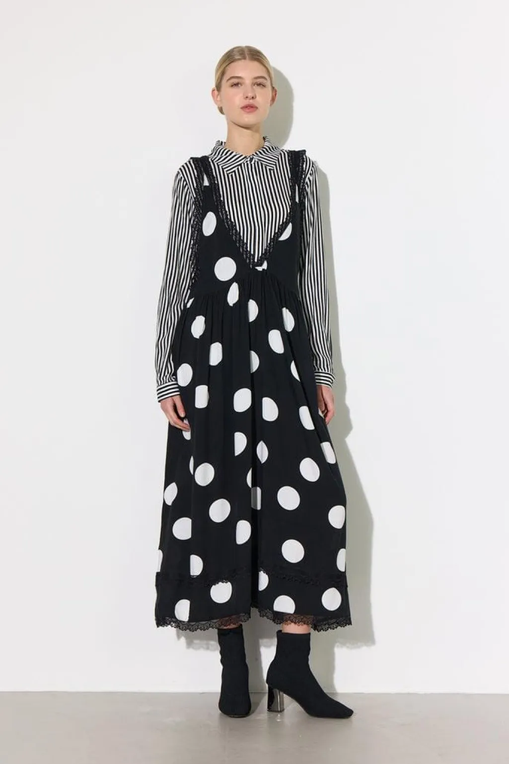 Sort kjole fra Hunkøn med store hvide prikker. Kjolen har en dyb V-udskæring foran og bagpå, trimmet med blonde, og et ærmeløst design med løs pasform.